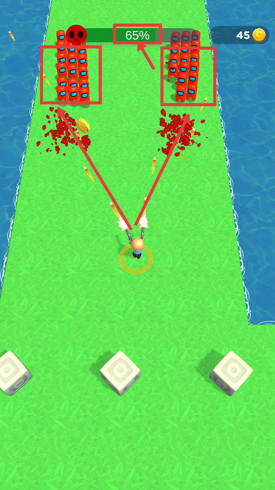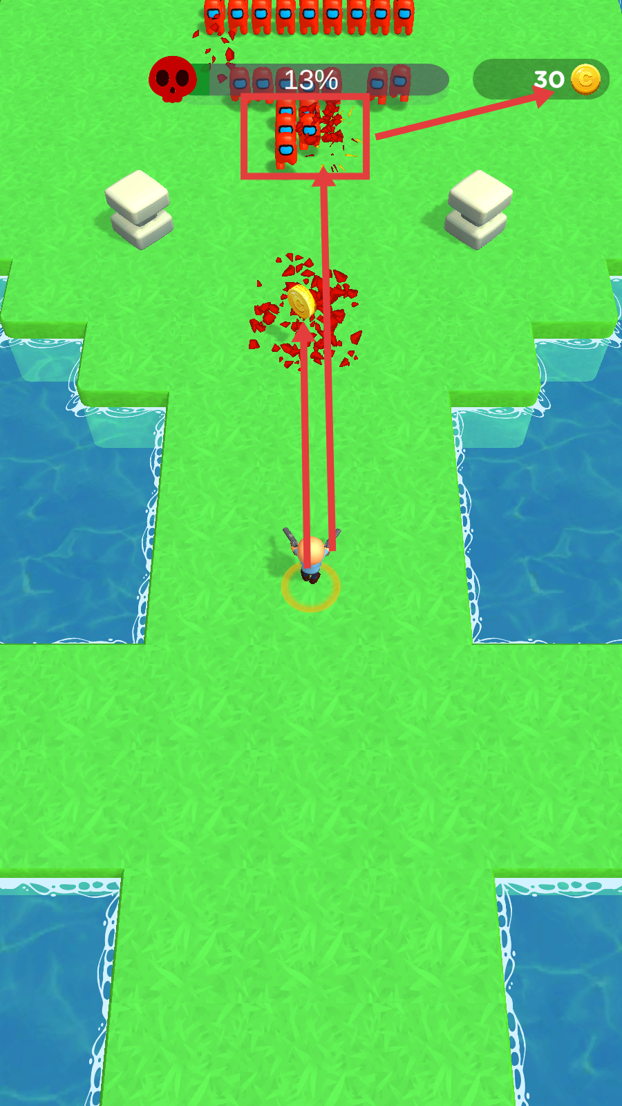 2、移动角色后,向红色敌人发起攻击,消灭敌人可获取金币,要及时收集敌人掉落的金币。