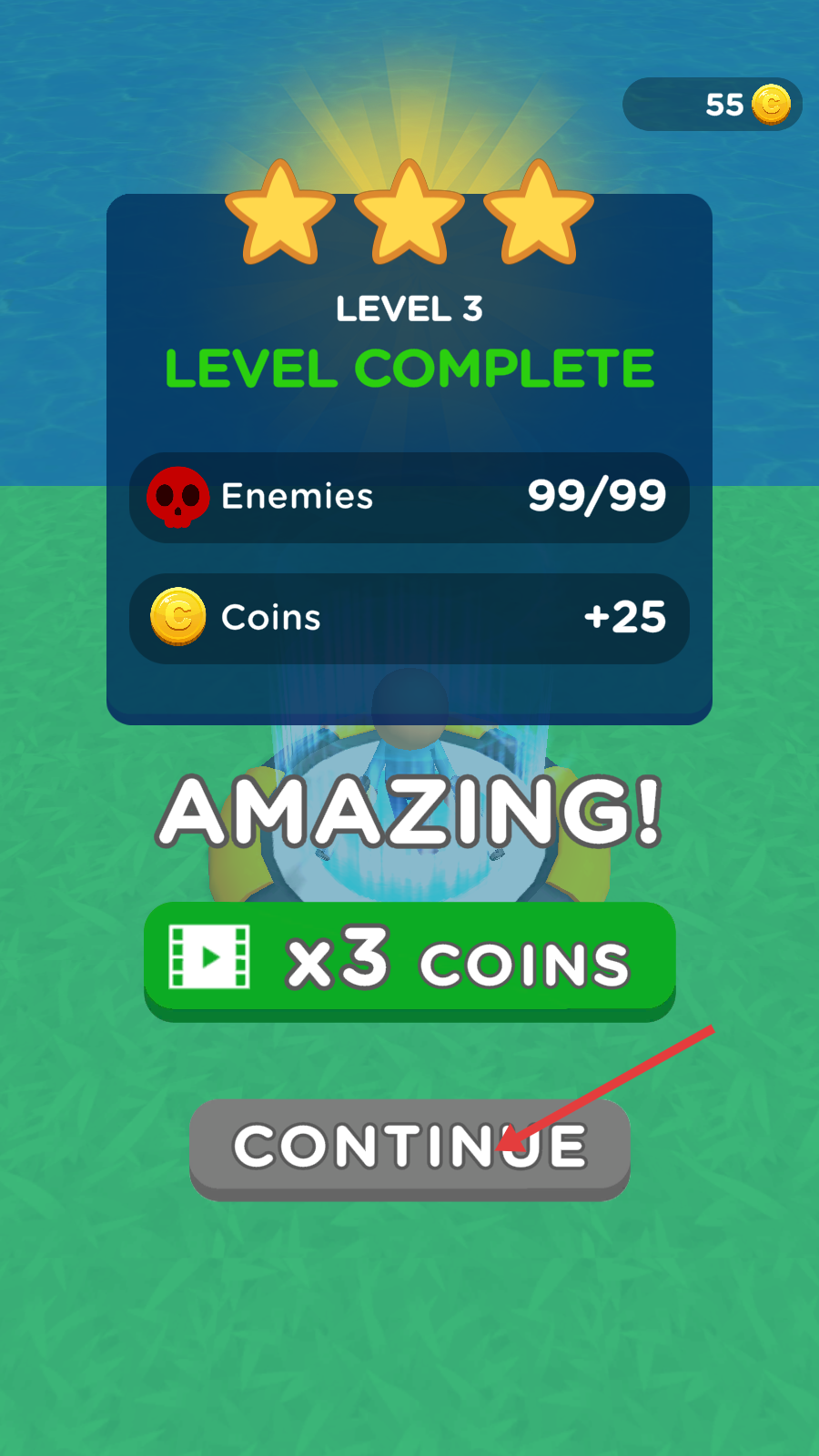 4、成功消灭所有敌人后,界面显示【LEVELCOMPLETE】,可点击【CONTINUE】按钮继续游戏,也能看广告获得3倍金币奖励。