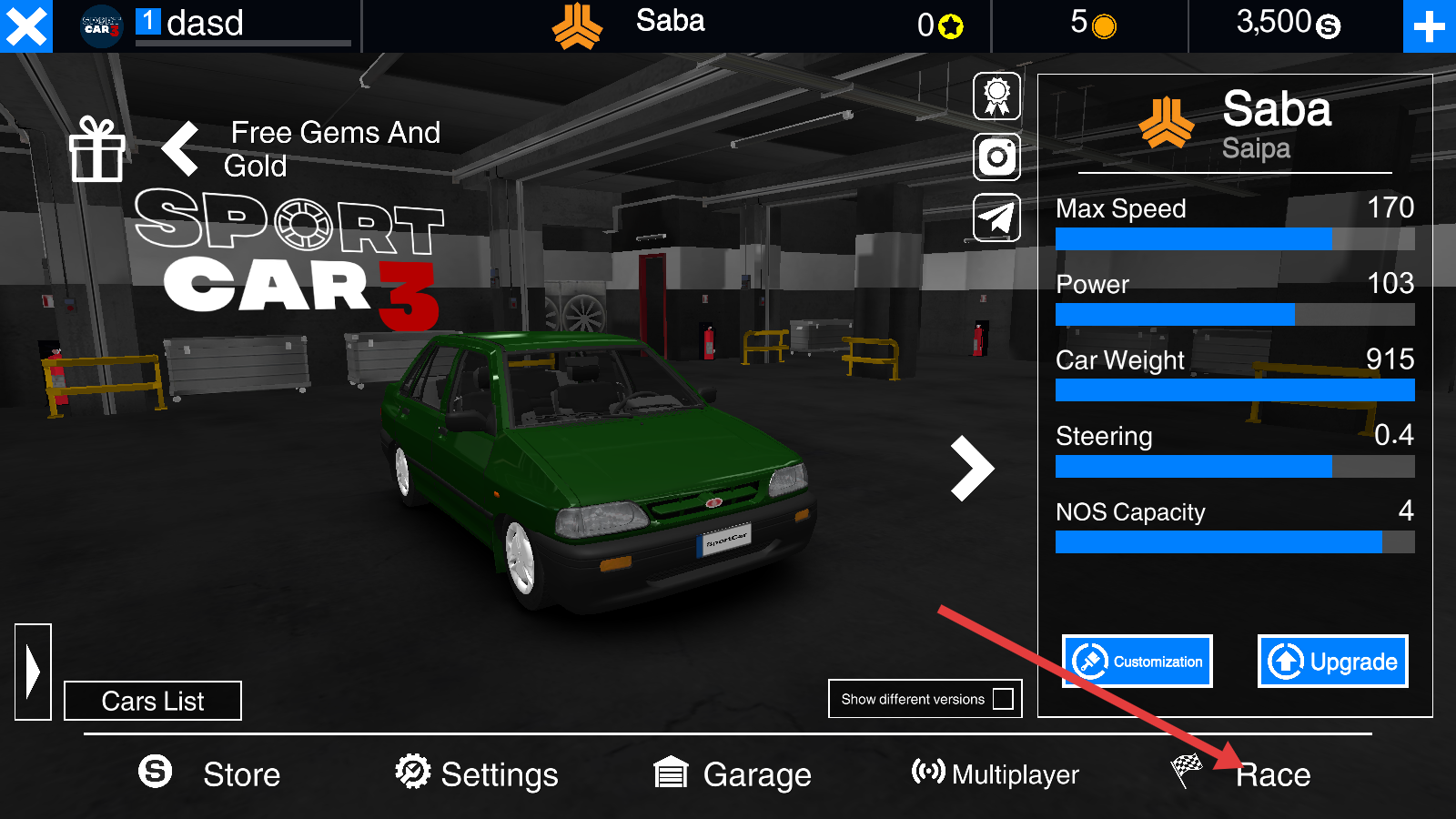 1、在《SportCar3》车库界面,查看绿色车辆Saba的【Max-Speed】【Power】等属性后,点击【Race】按钮进入比赛。