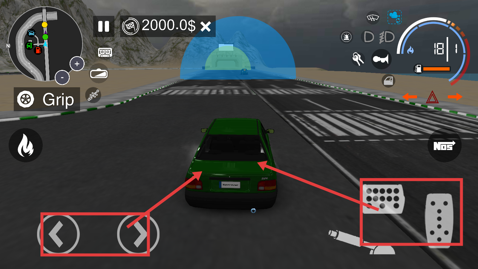 2、驾驶过程中,用左侧左右箭头按钮控制车辆转向,右侧按键控制油门与刹车,还可借助【NOS】功能提升车速。