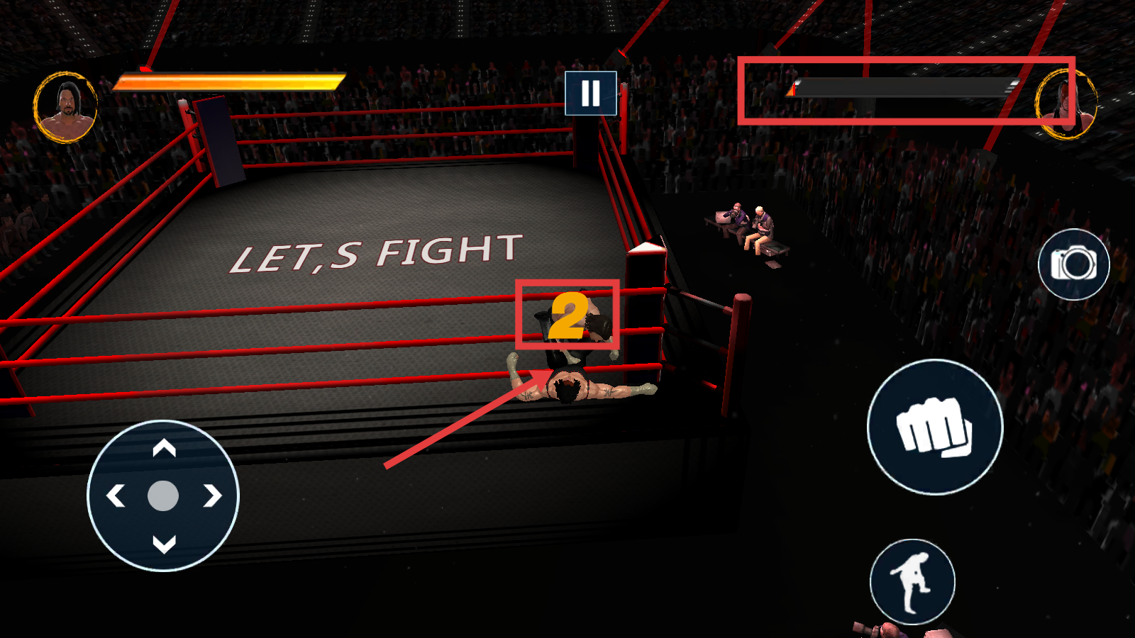 3、将对手逼至擂台边缘后,尝试压制对手,留意压制时的倒计时(如显示“2”的计数),持续保持压制状态。