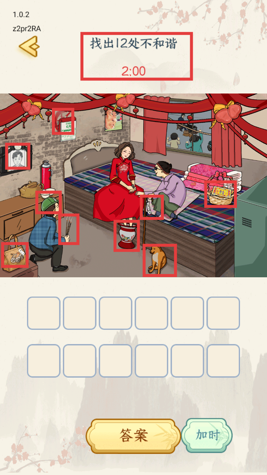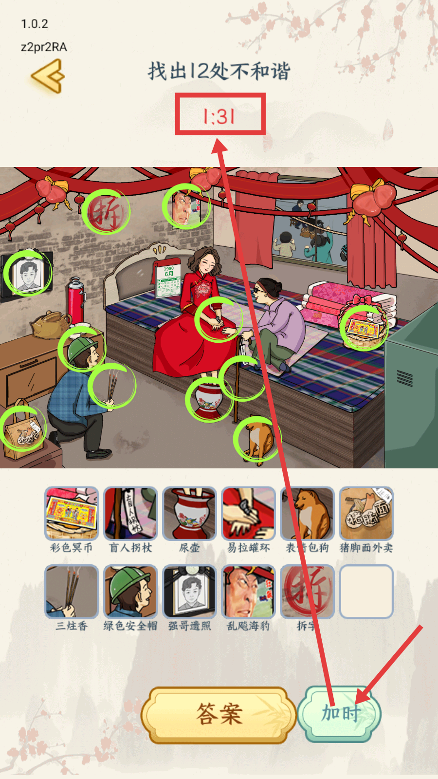 3、若寻找不和谐之处时时间紧张,可点击【加时】按钮增加时间,再结合下方的物品选项,匹配场景里的不和谐元素。