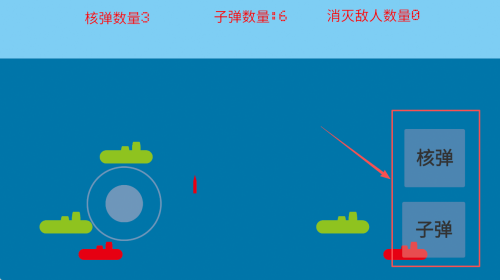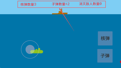 3、操作潜艇:使用屏幕左下角的虚拟摇杆控制潜艇移动,点击“核弹”或“子弹”按钮进行攻击。