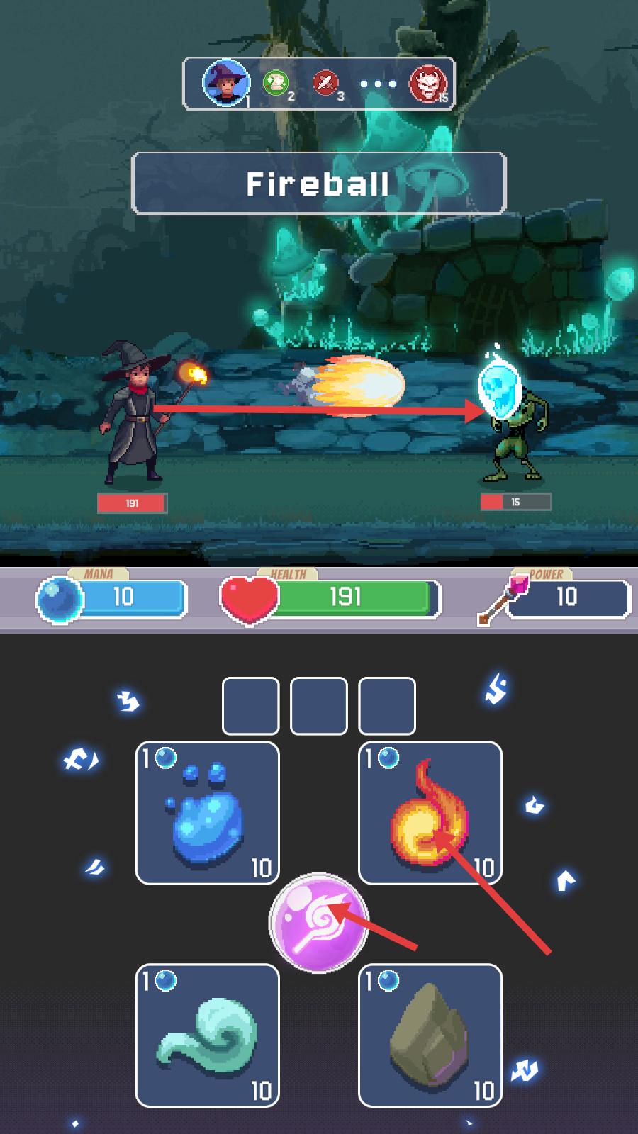 2、战斗时,选择【Fireball】技能攻击敌人,同时关注自身【Mana-10】【Health-191】【Power-10】等属性变化。