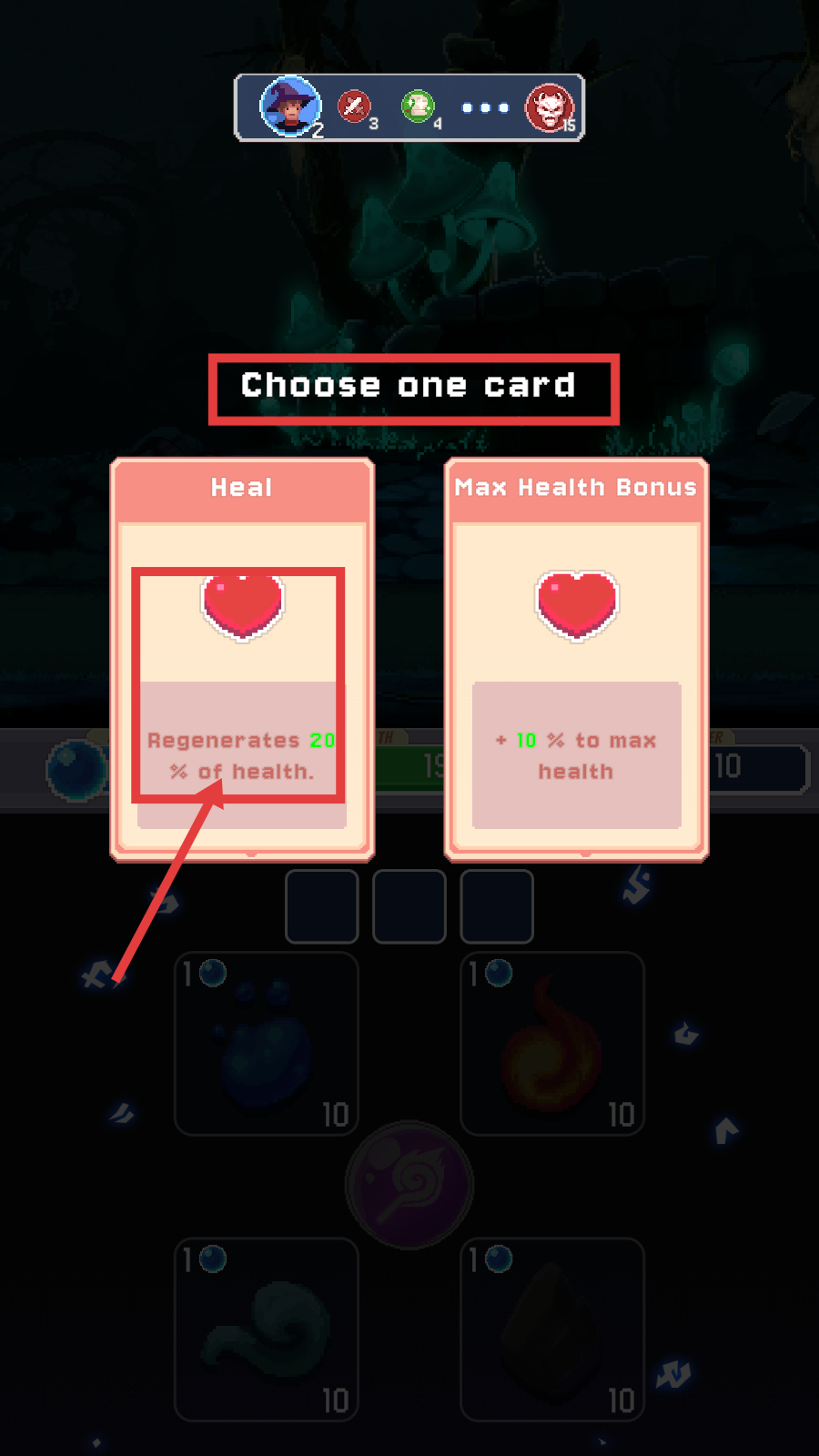 3、战斗后出现选卡界面,可选择【Heal】卡牌,它能恢复20%的生命值,助力后续战斗。