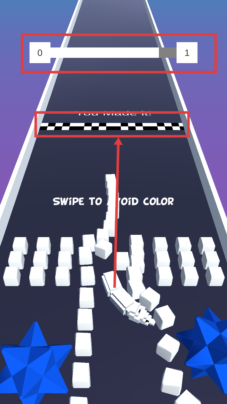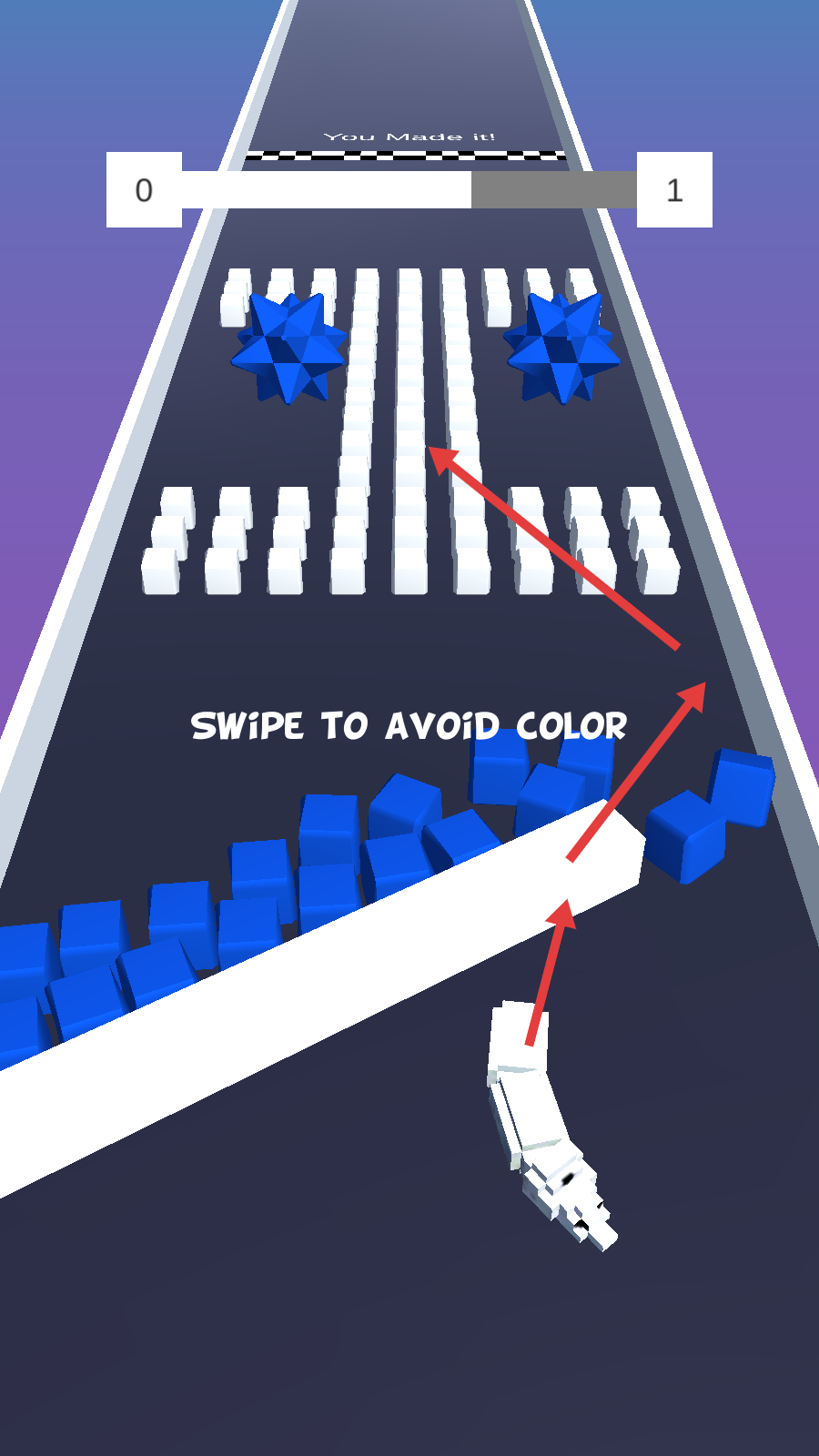 1、进入【Level-1】,看到【SWIPE-TO-AVOID-COLOR】提示,滑动控制白色物体,避开蓝色障碍物前进。