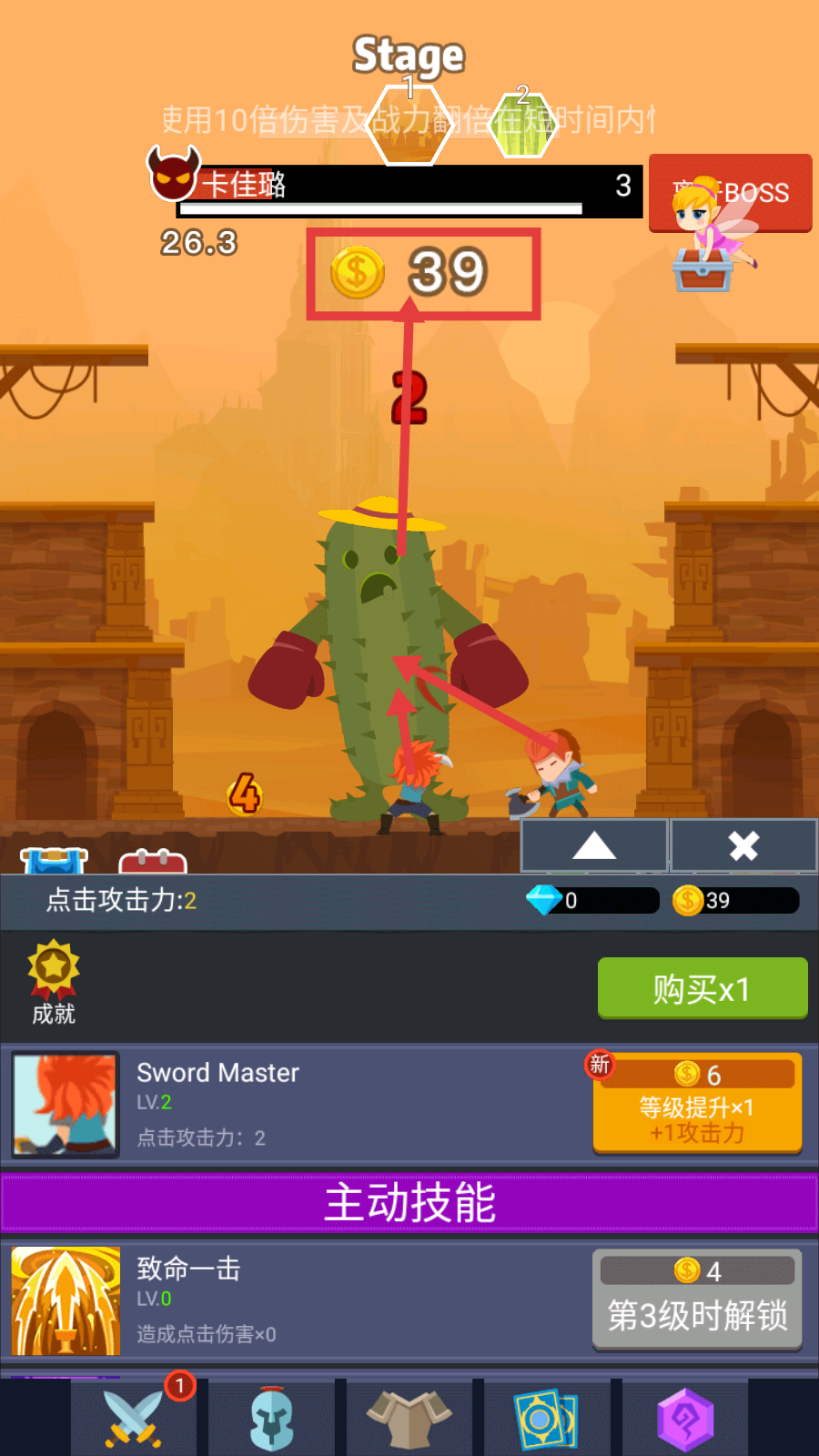 1、在【Stage-1】,攻击仙人掌怪“卡佳璐”,通过点击提升伤害,积累金币,此时金币数为【$39】,为后续强化做准备。