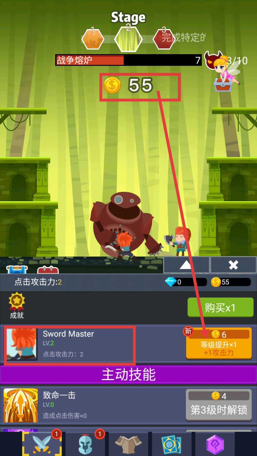 2、进入【Stage-2】,挑战“战争熔炉”,利用积累的金币,花费【$6】提升【Sword-Master】等级,增加点击攻击力。