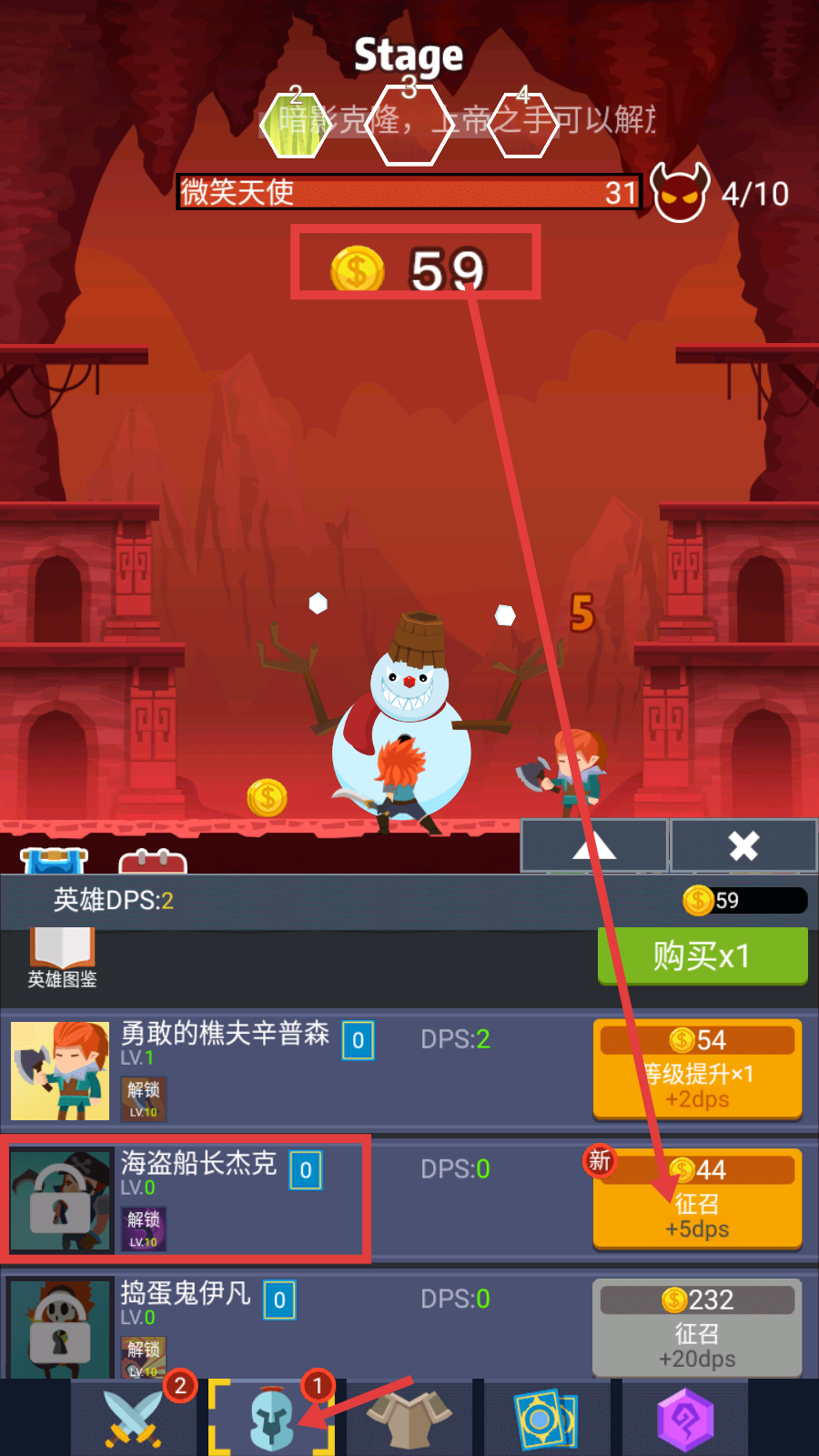 3、到【Stage-3】,应对“微笑天使”,用金币征召新英雄,比如花费【$44】征召“海盗船长杰克”,提升队伍DPS。