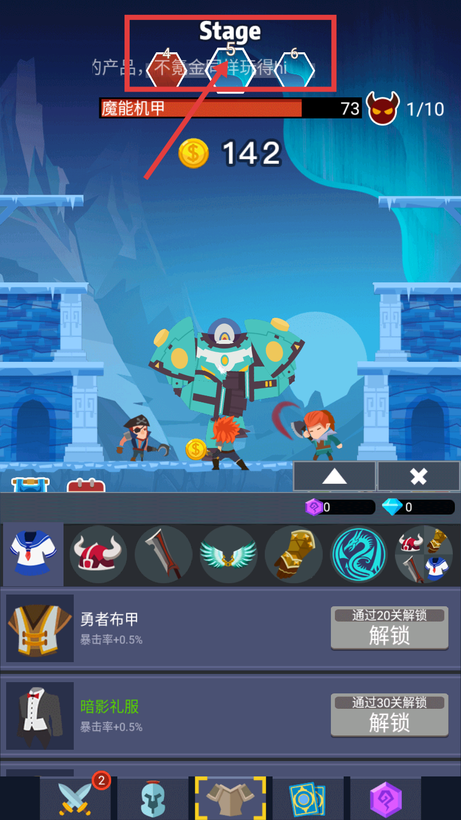 4、推进到【Stage-5】,挑战“魔能机甲”,积累足够金币后,可解锁“勇者布甲”“暗影礼服”等装备,提升暴击率等属性。