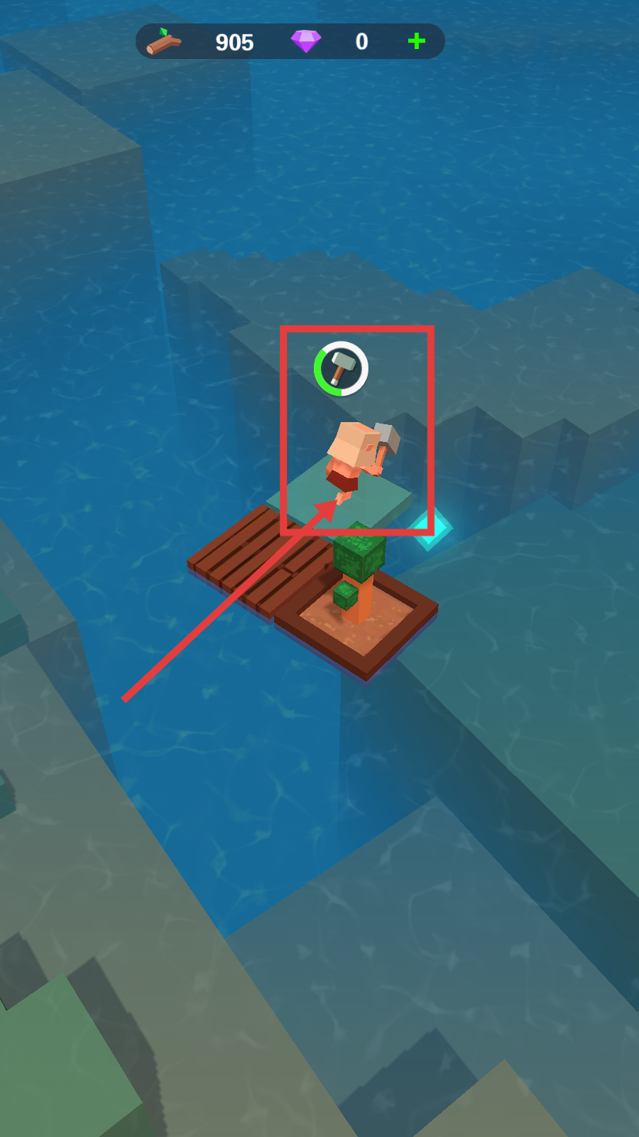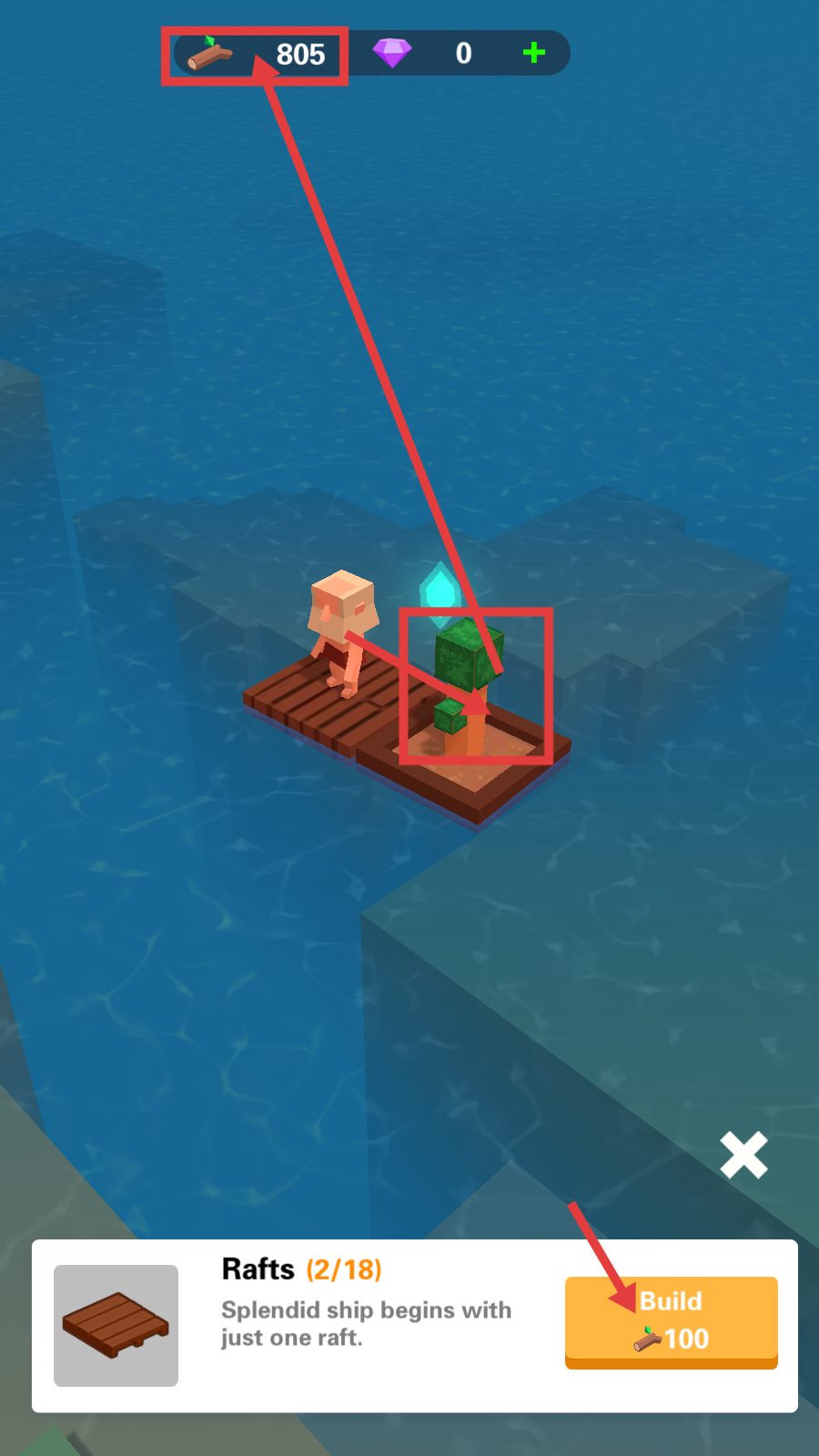 1、开局查看木材数量【805】,点击黄色【Build-100】按钮,消耗木材建造木筏,推进【Rafts-(2/18)】的建造进度。