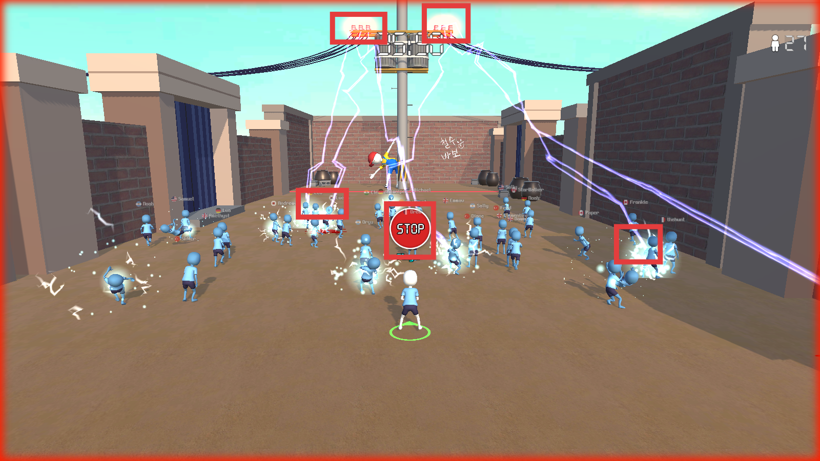 2、战斗时,面对大量蓝色小人敌人,注意躲避闪电攻击,同时借助场景元素牵制敌人,留意【STOP】提示的操作时机。