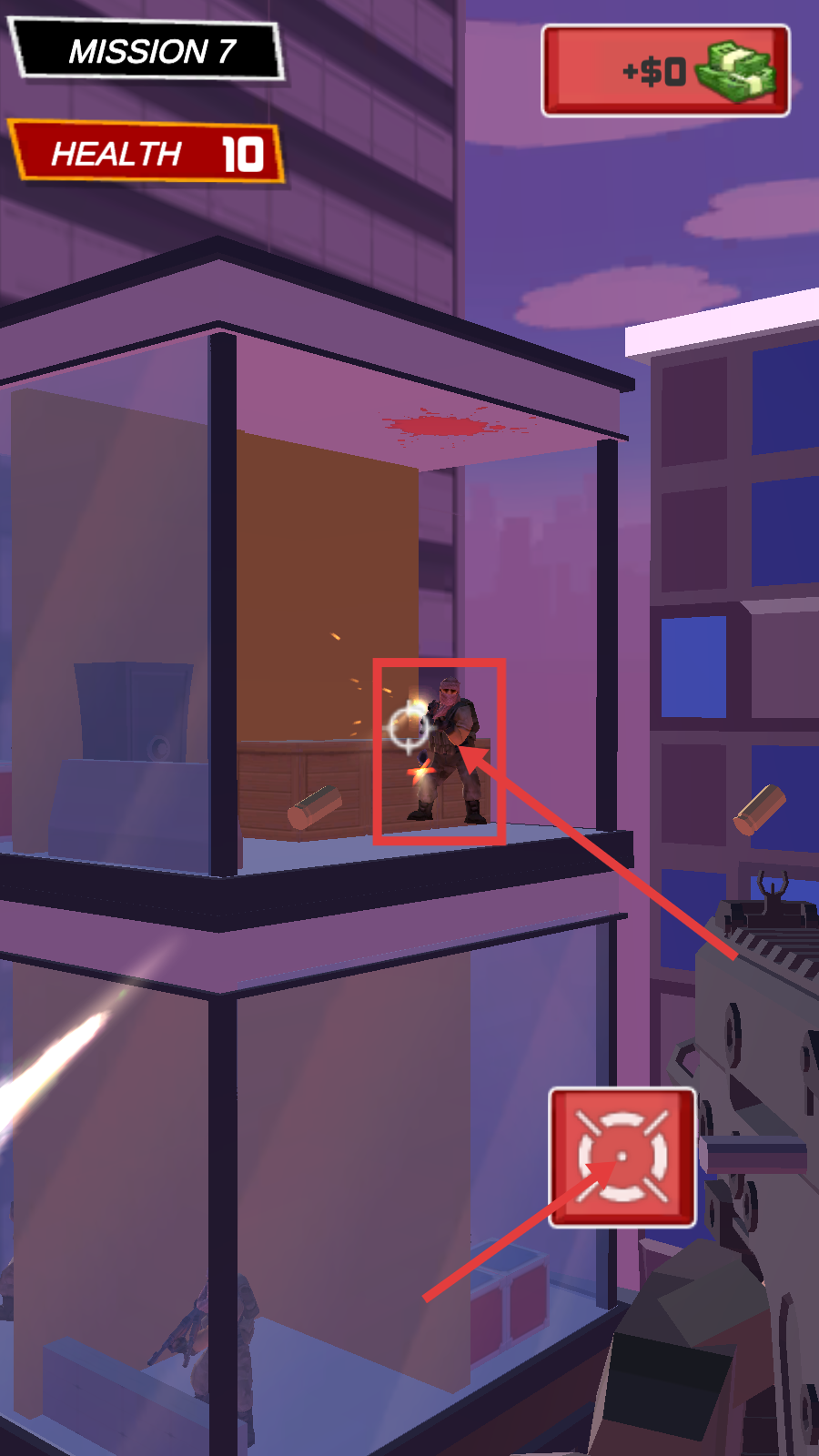3、任务7战斗时,瞄准建筑上的敌人,点击射击按钮发起攻击,同时留意左上角【HEALTH-10】的生命值,避免被敌人击中。