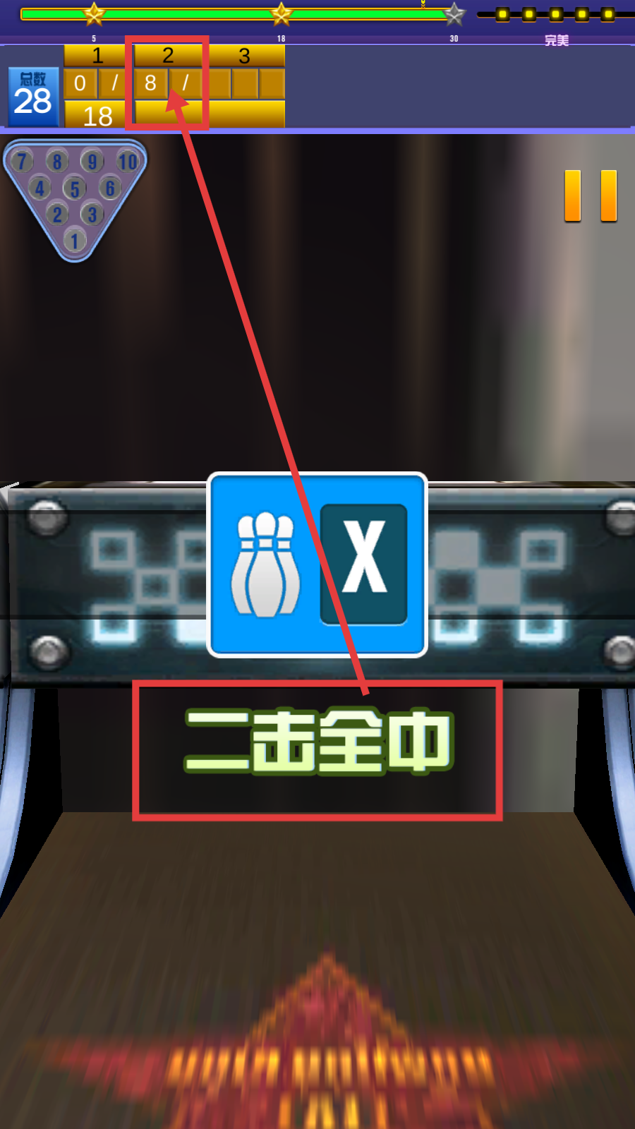 3、若首投未全中,第二投需快速调整球的角度,精准击中剩余瓶瓶,成功触发【二击全中】判定提升得分。