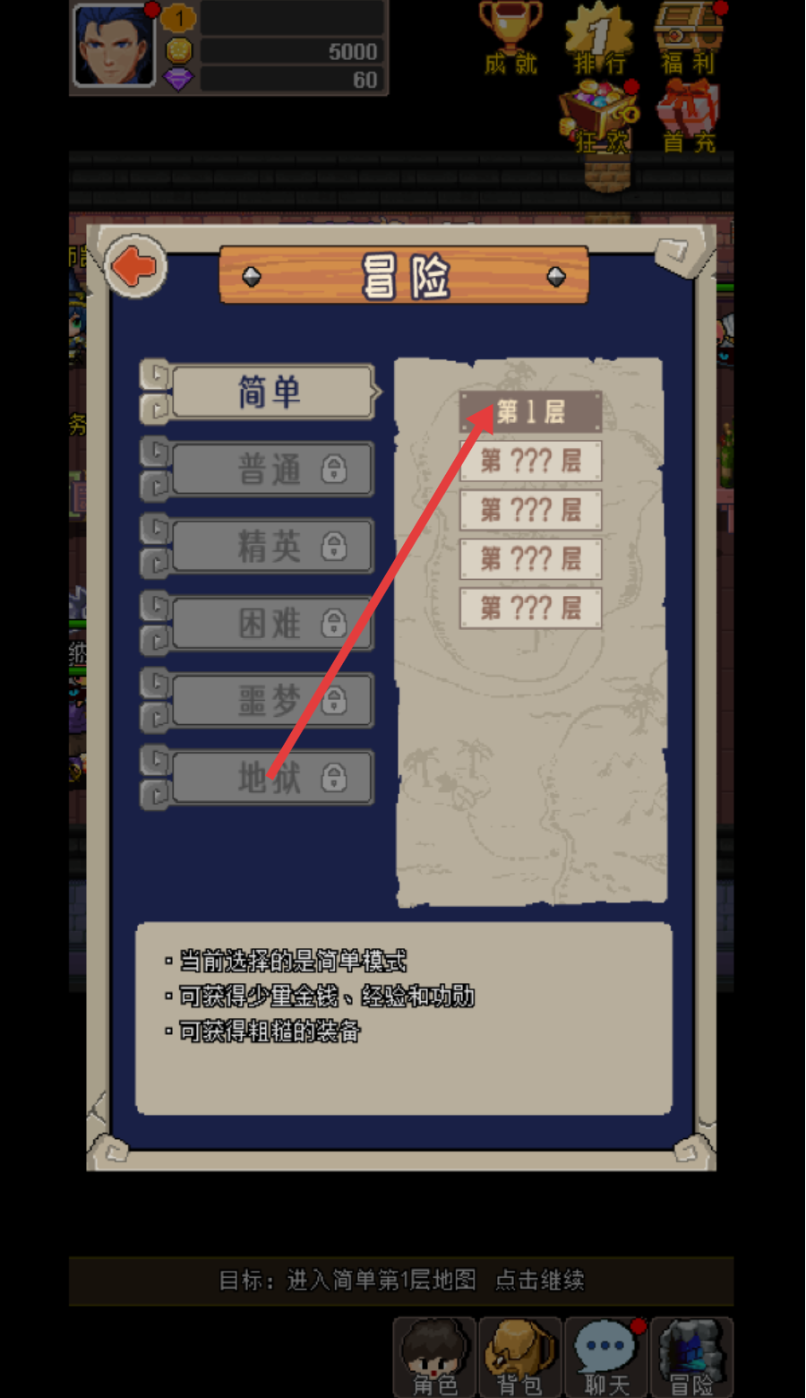 1、进入冒险界面,优先选【简单-模式】的【第1层】,该模式能获取基础资源,适合新手起步。