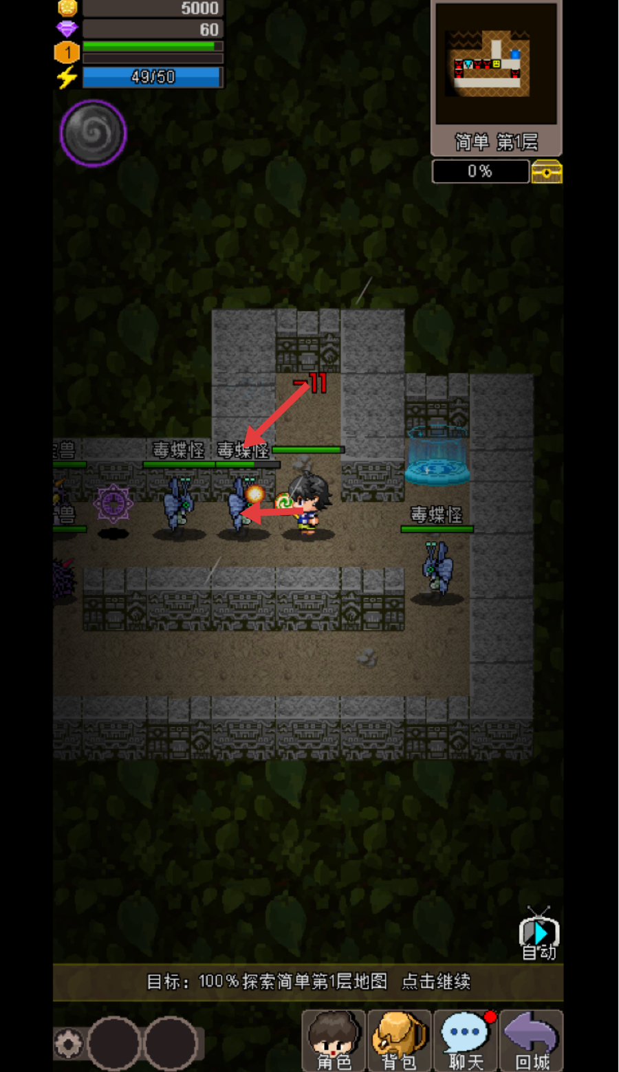 2、在【简单第1层】地图,操控角色攻击【毒蝶怪】,同时逐步探索地图区域,推进探索进度。