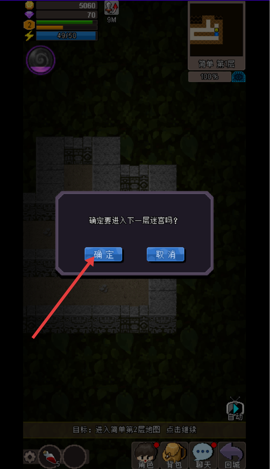 4、当【简单第1层】探索度达100%时,点击【确定】进入下一层迷宫,继续挑战更难内容。