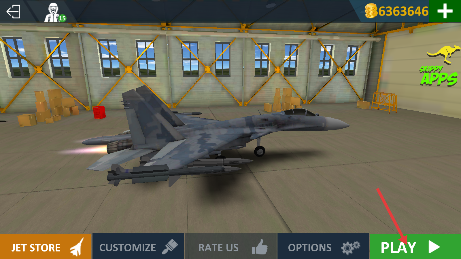 1、在机库界面点击【PLAY】开启任务,出发前可查看战机状态,确保弹药与燃料充足再行动。