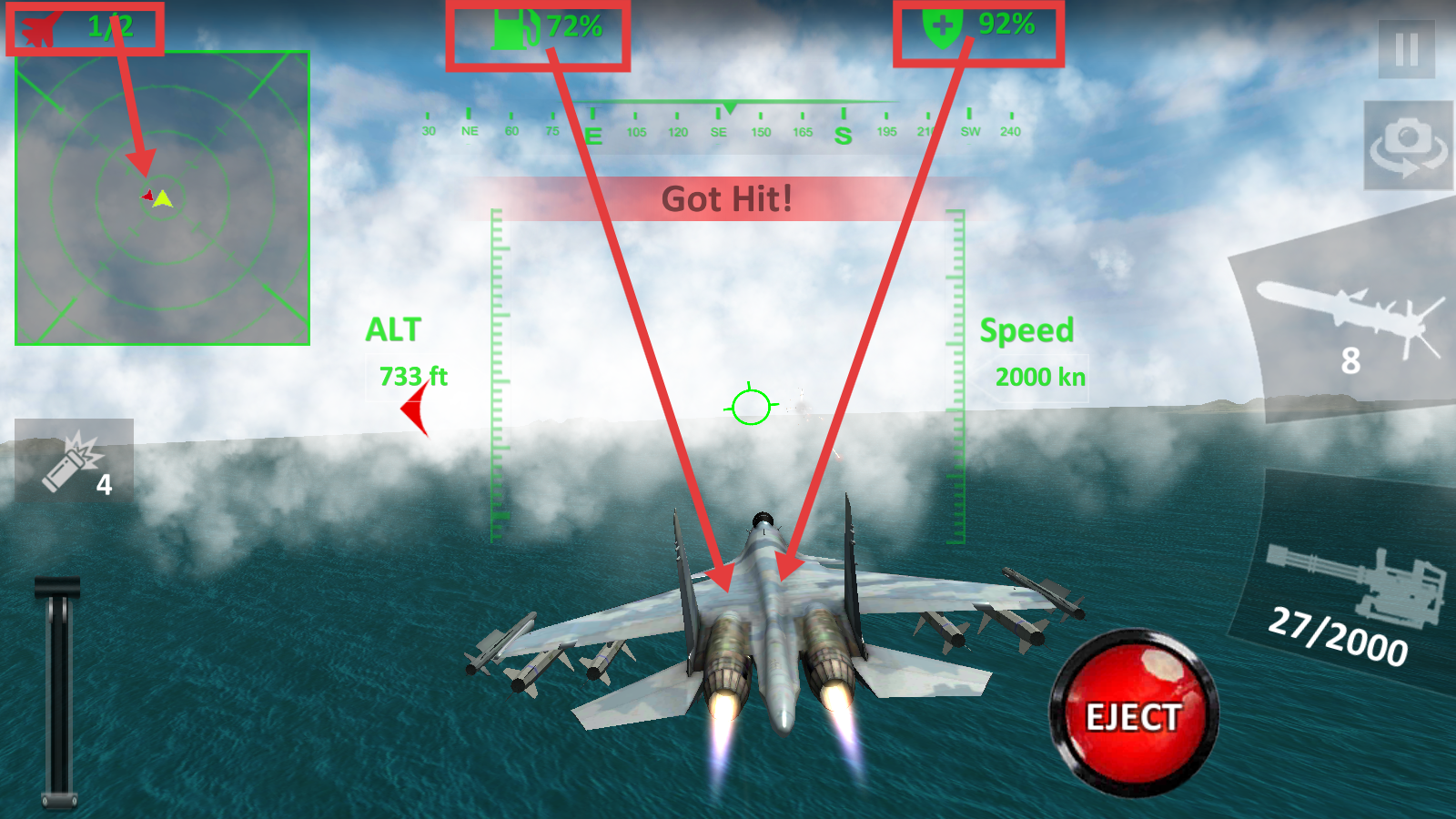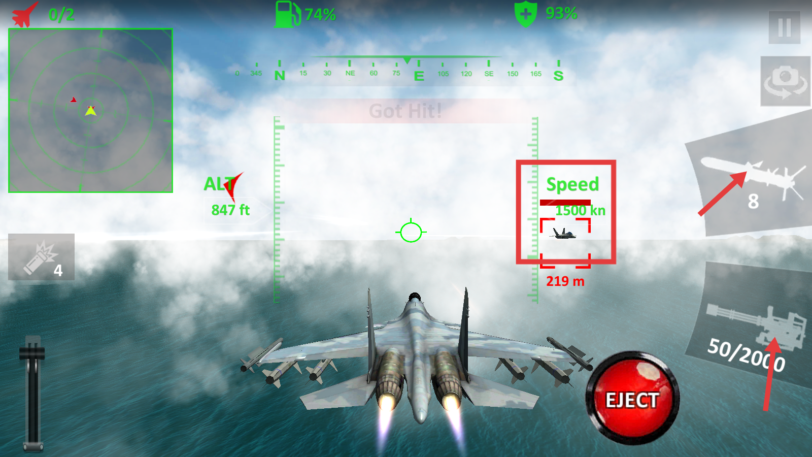 2、飞行过程中关注右侧【Speed】数值,保持合适速度追击目标,遇敌可点击导弹图标发起远程攻击。