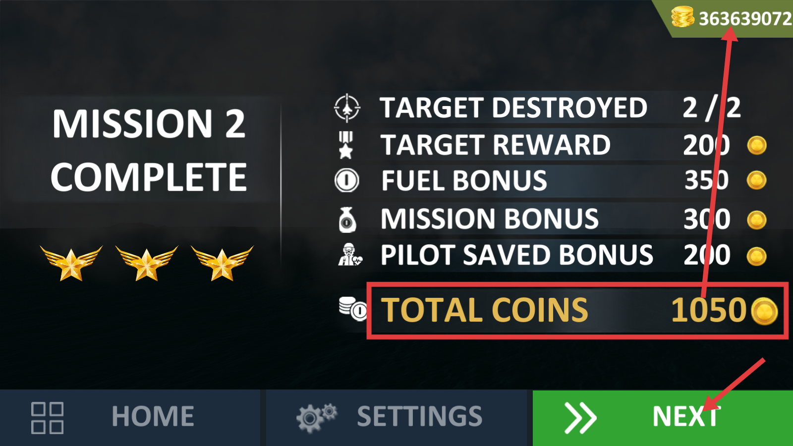 4、完成任务(如【MISSION-2】)后,能获得【1050-金币】等奖励,点击【NEXT】进入下一个任务,积累金币用于升级战机。