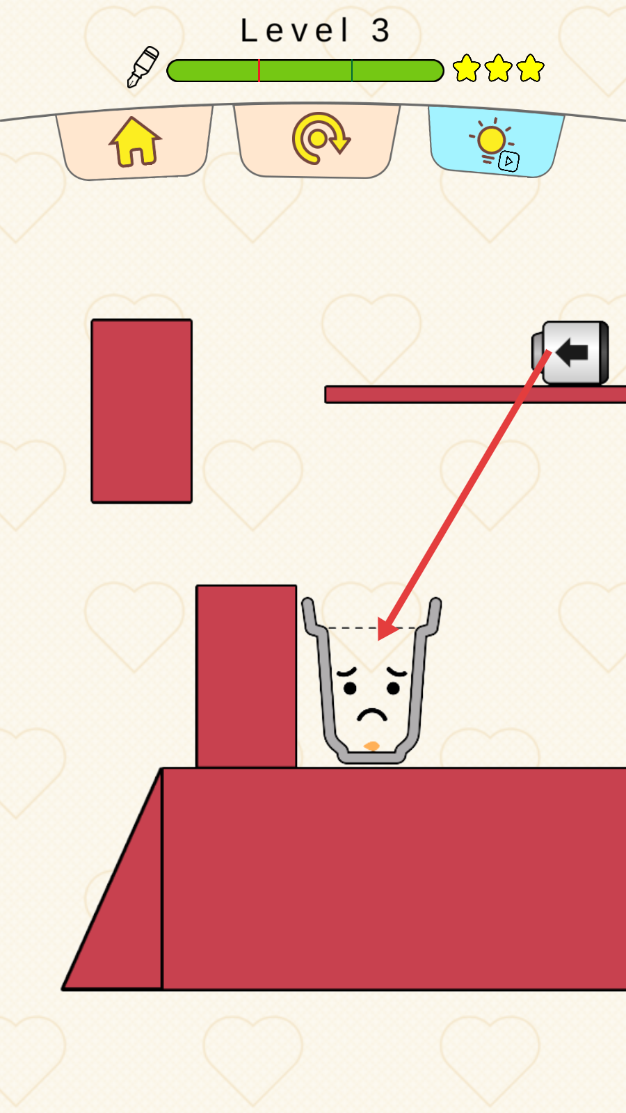 3、用画笔在障碍物间画线条,引导上方装置流出的水注入杯子,随着水流增加,杯子会变开心,上方进度条也会推进。