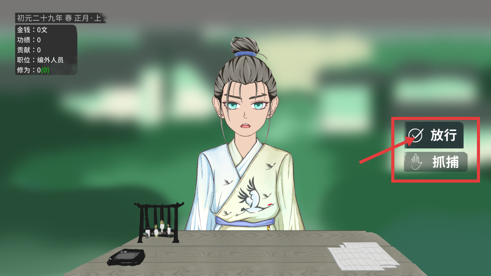 2、面对人物时,留意左侧【金钱-0文】【功绩-0】等状态,再根据情况选择【放行】,推进基础流程。