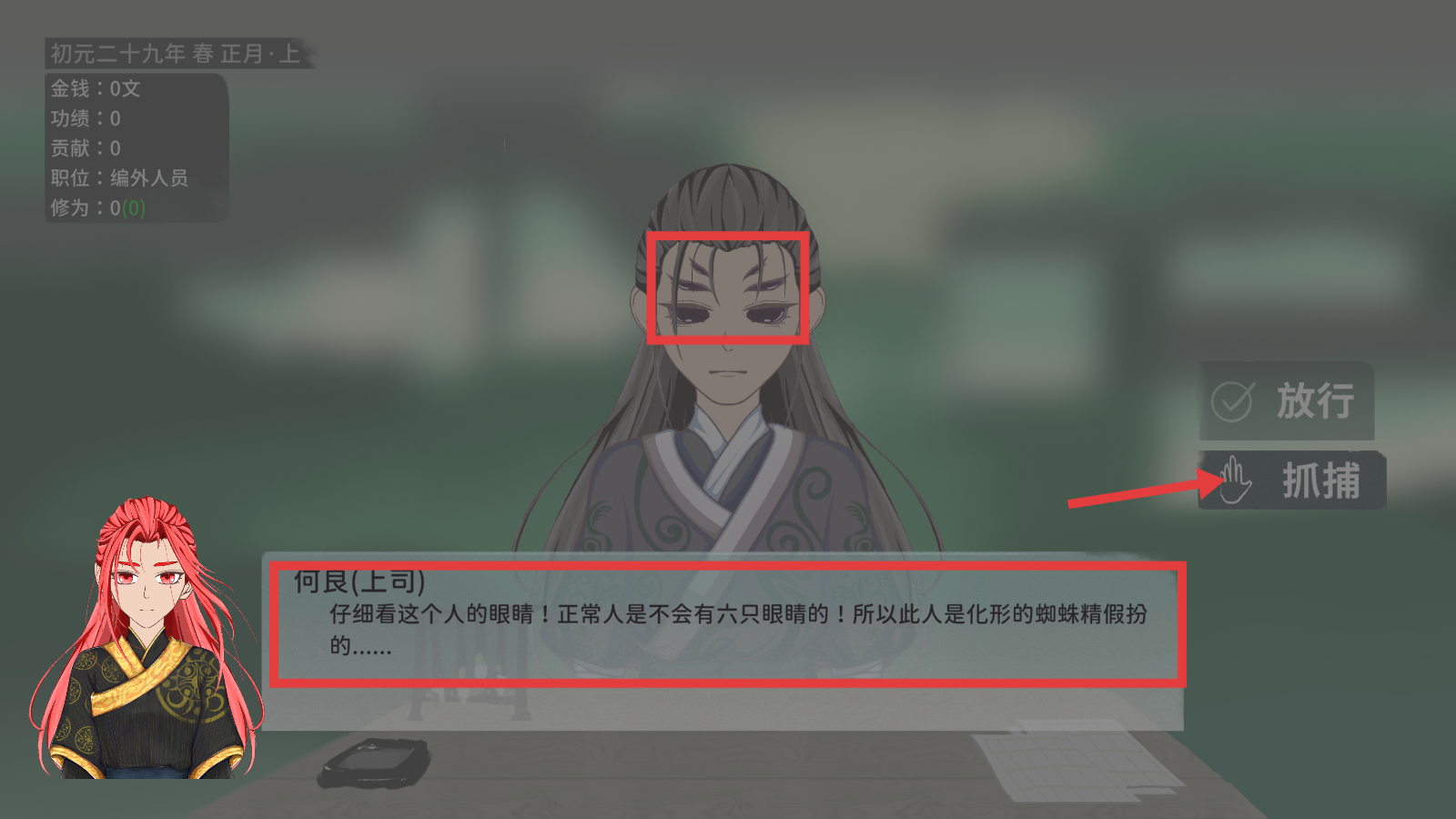 3、听上司【何良】的提示,仔细观察人物眼睛等特征,发现异常(如六只眼睛)时,选择【抓捕】,识破妖怪伪装。
