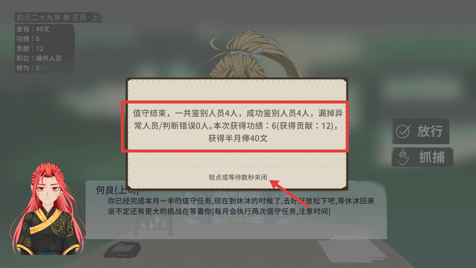 4、值守结束后,查看结算面板,确认【功绩-6】【贡献-12】和【40文】月俸获取,为后续值守任务积累资源。