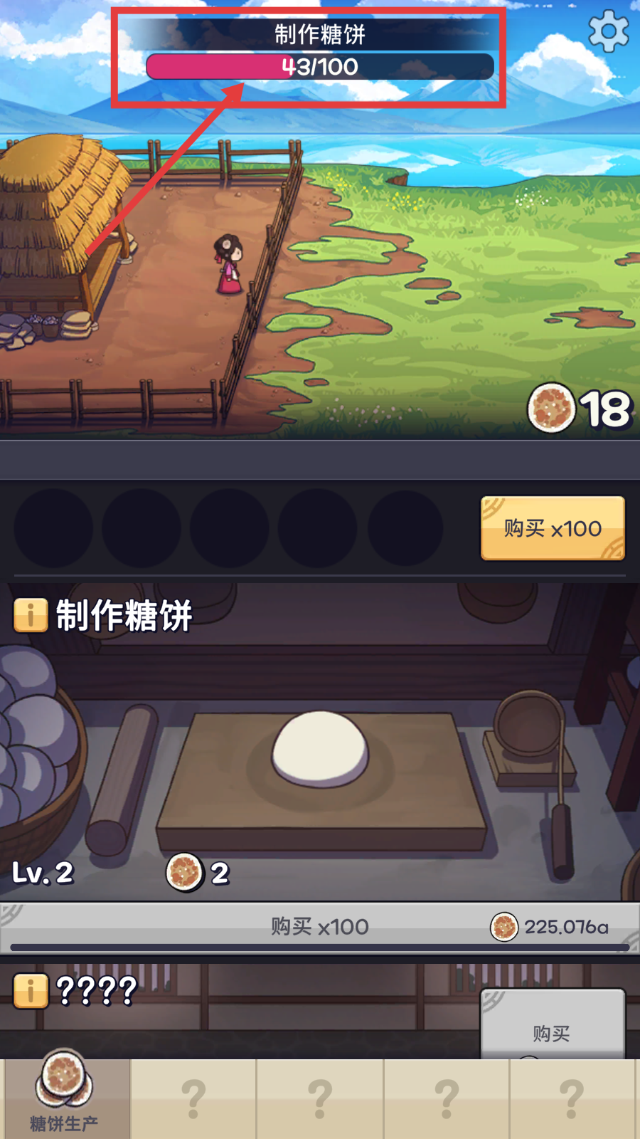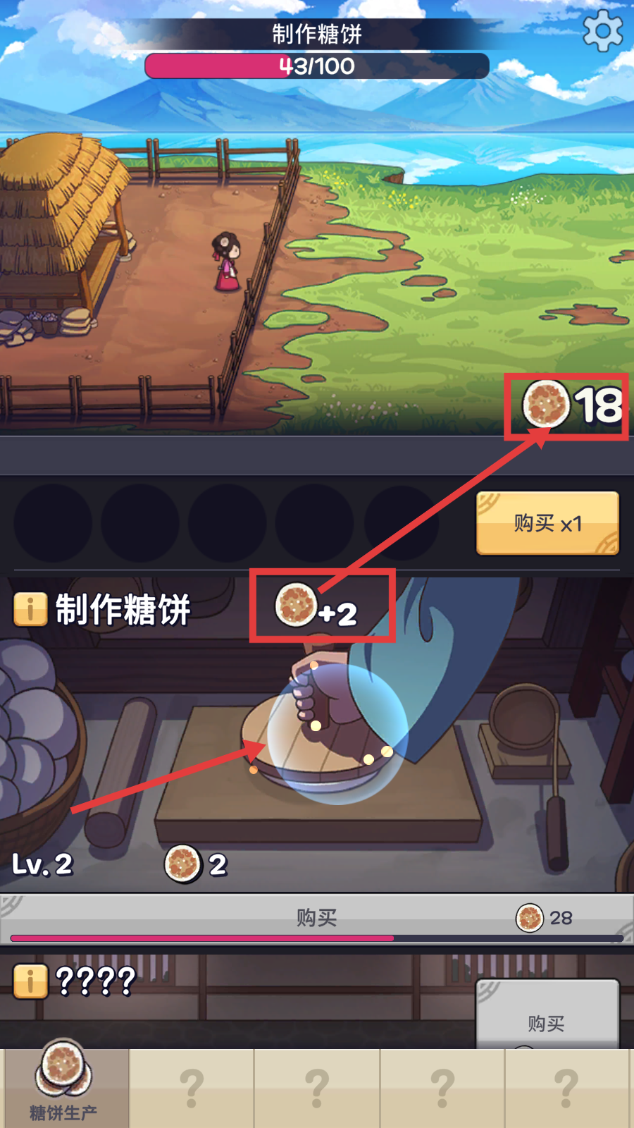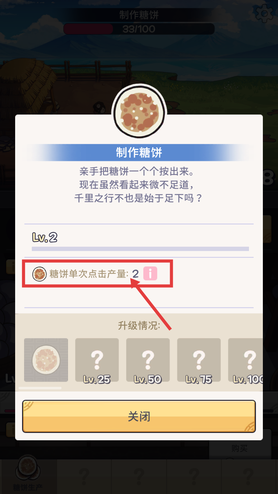 1、制作糖饼时,关注【糖饼单次点击产量-2】,提升等级可增加产量,为后续发展打基础。