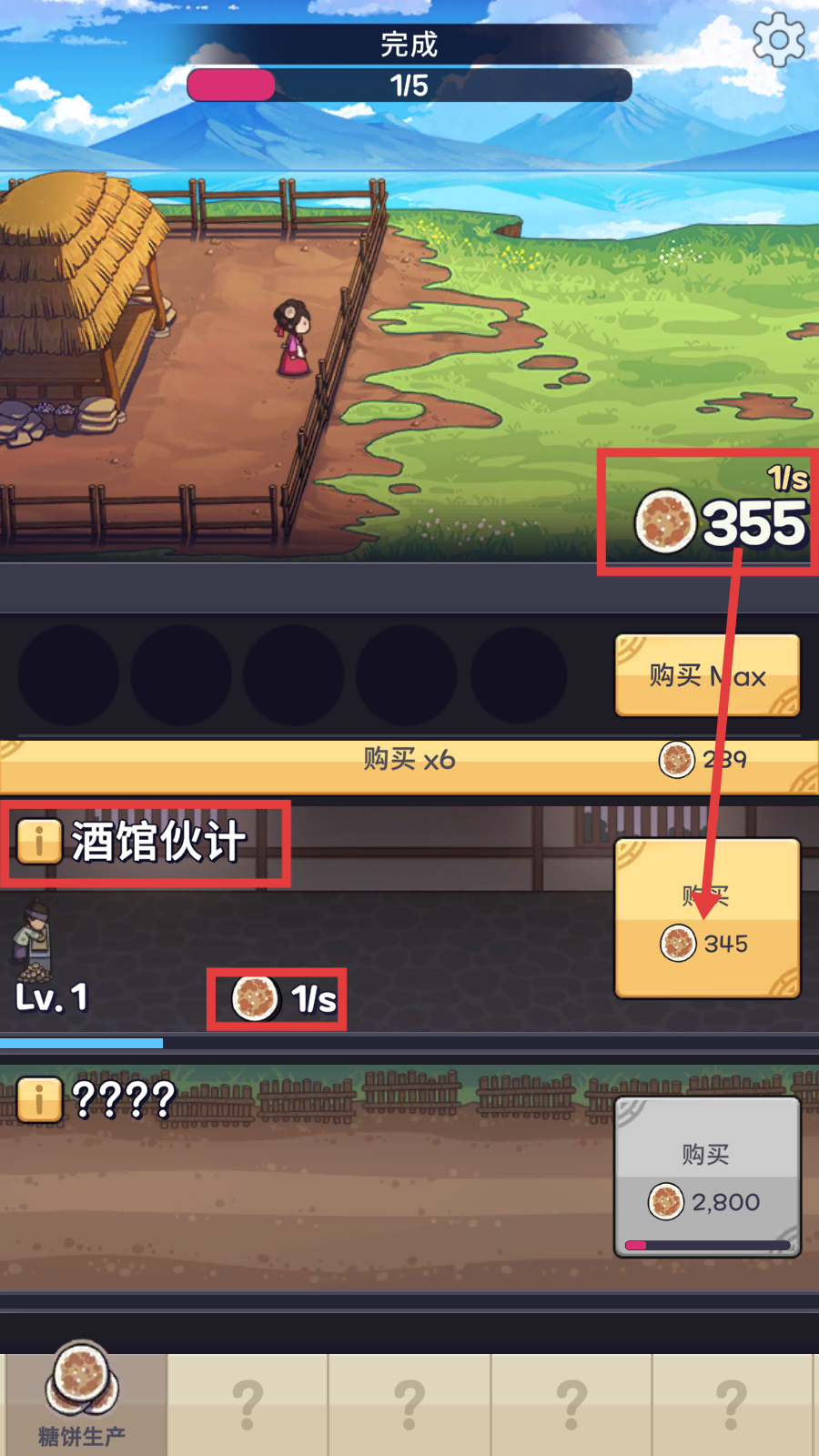 4、解锁【酒馆伙计】等自动生产单位,利用其【糖饼-1/s】的产量,结合购买功能,提升糖饼获取效率。