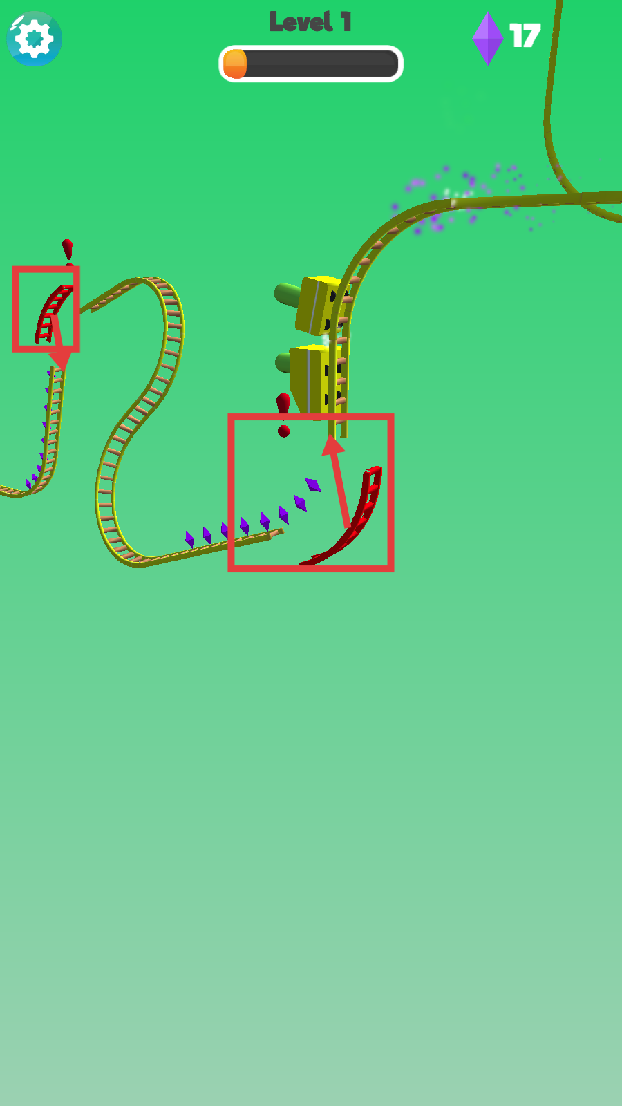 2、操控过山车在轨道上行驶,通过点击屏幕连接红色的铁轨,留意轨道变化,顺利通过弯道和坡道。