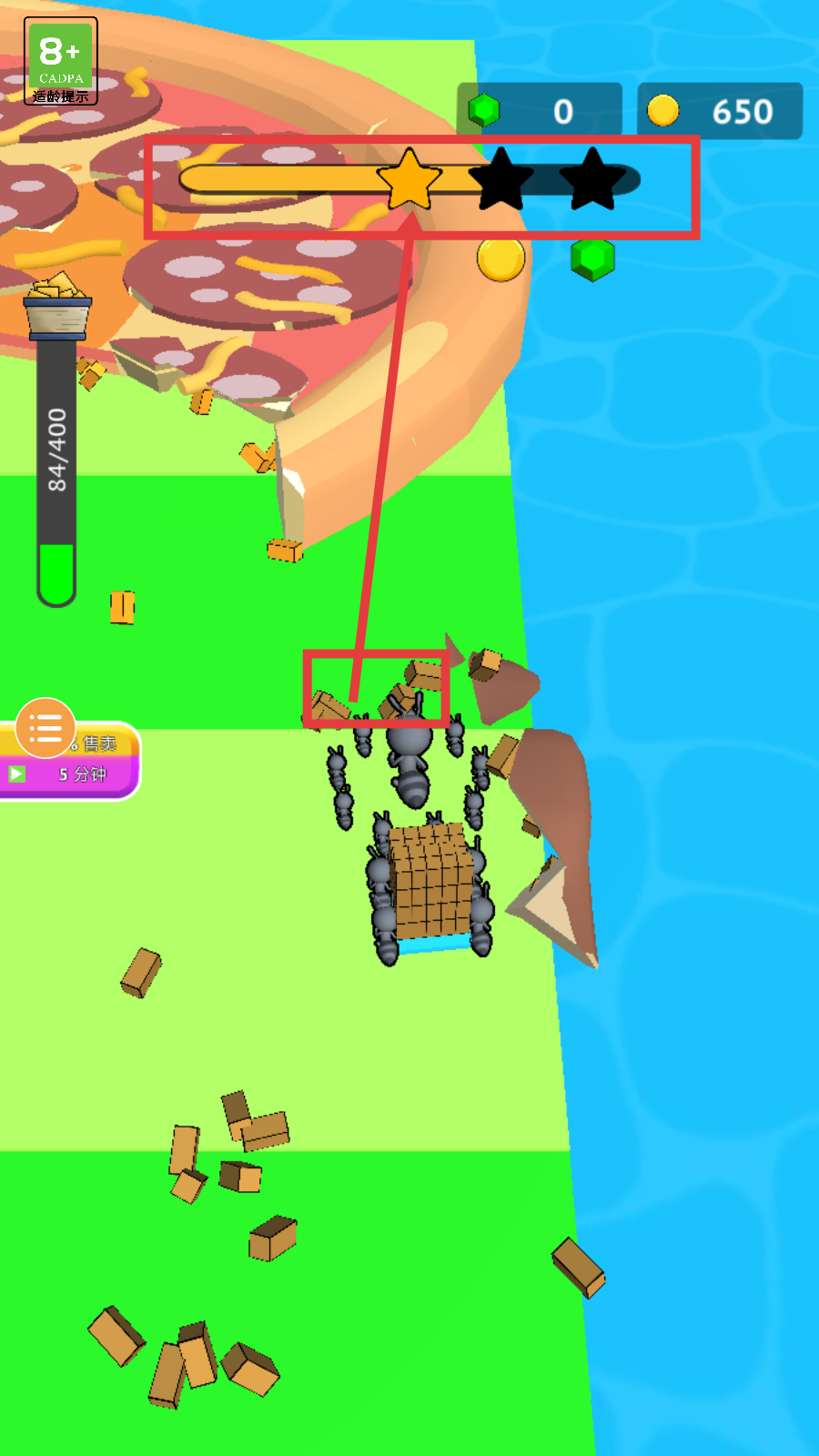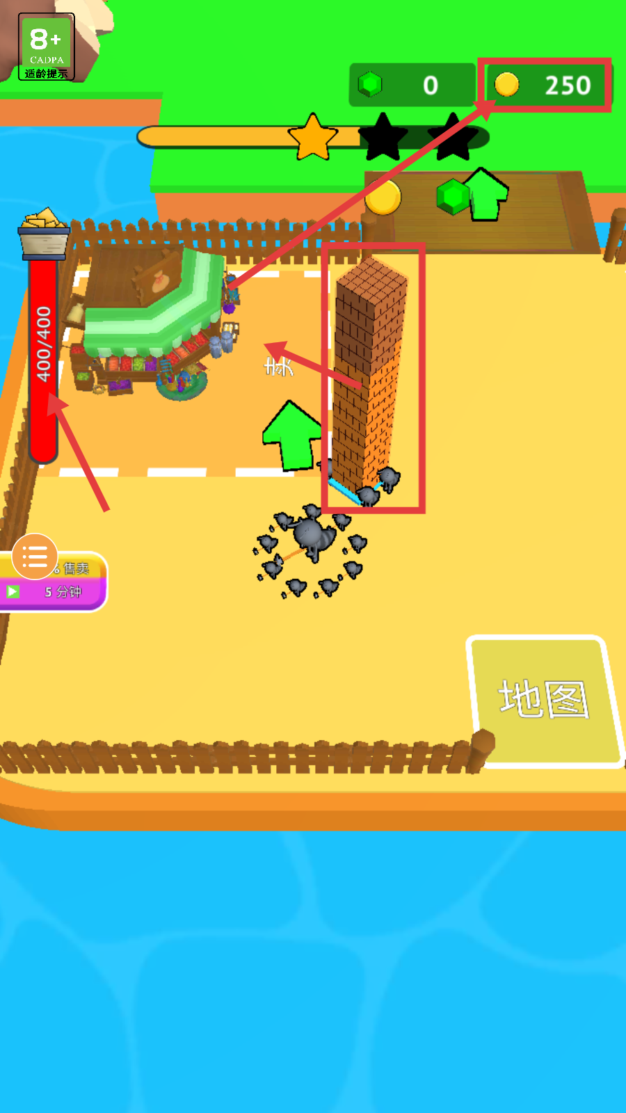 2、蚂蚁建造砖块建筑,积累金币至【250】,推进左侧进度条至【400/400】,提升建筑和资源获取能力。