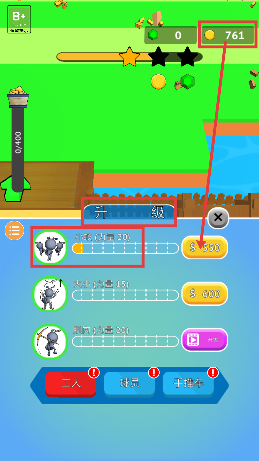 4、利用积累的金币【761】,升级【小蚁(力量20)】,提升蚂蚁力量,增强收集和建造效率,为后续关卡打基础。