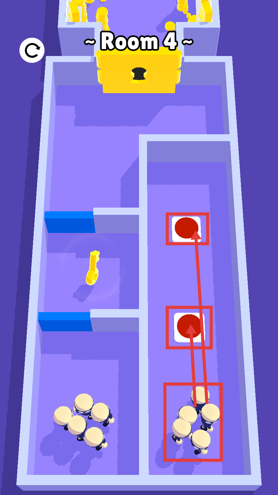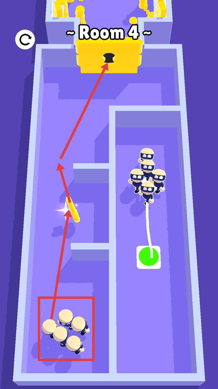2、在【Room-4】中,操控小偷踩红色按钮,避开警察,为收集钥匙和开启宝箱创造条件。