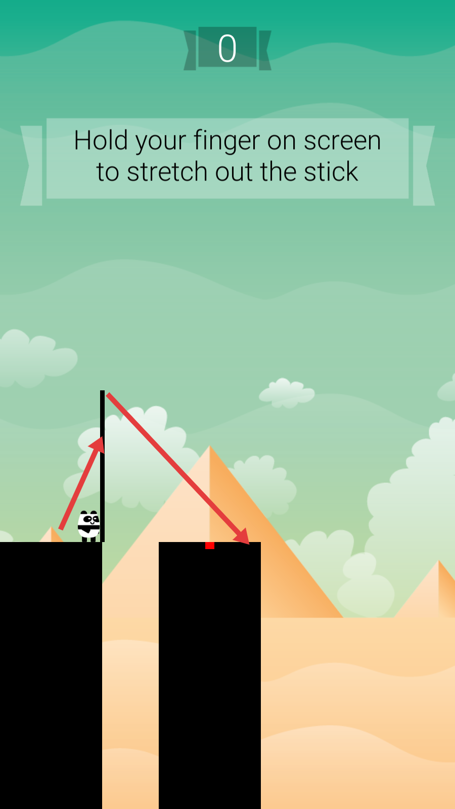 2、根据【Hold-your-finger-on-screen-to-stretch-out-the-stick】提示,长按屏幕拉伸棍子,帮助熊猫跨越平台。