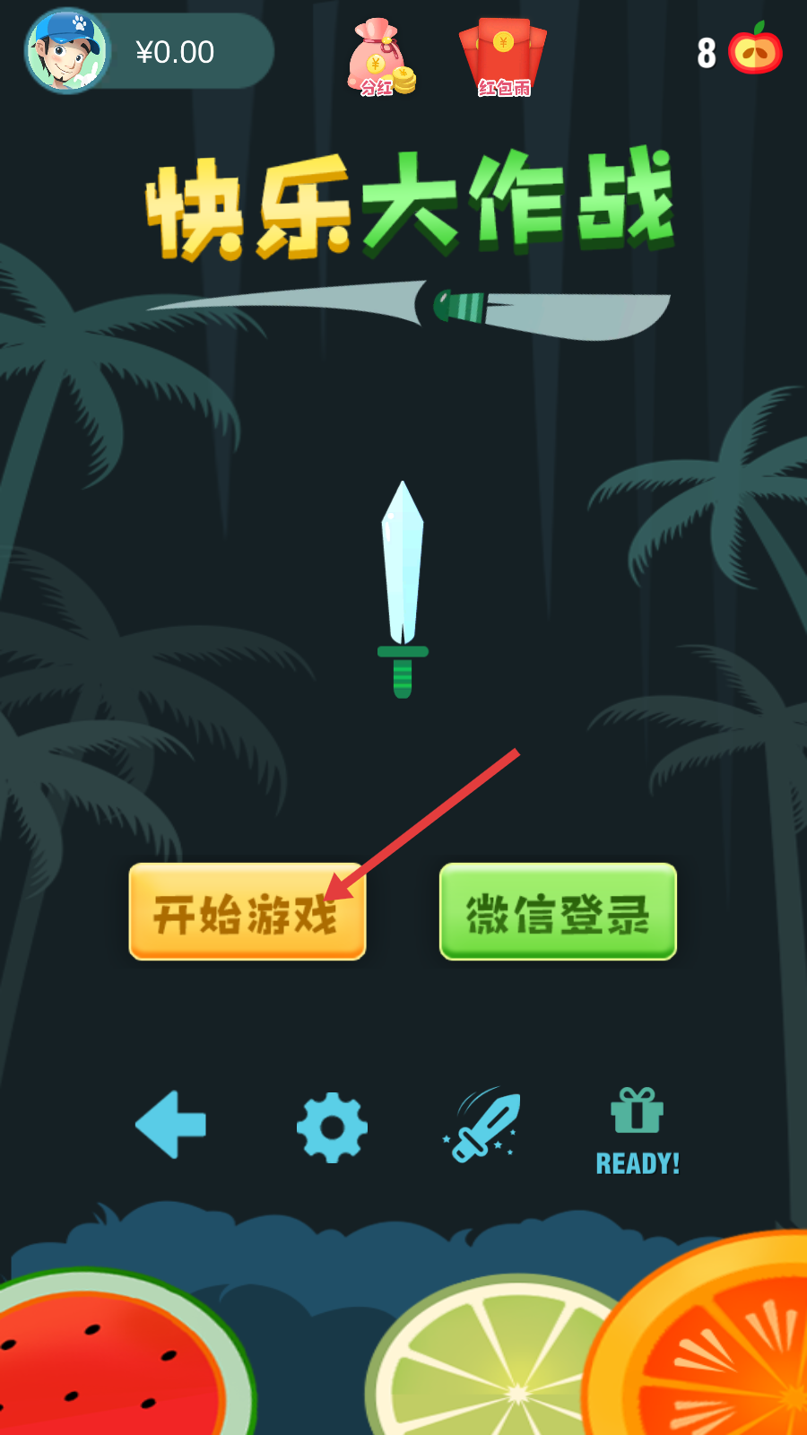 1、点击【开始游戏】按钮,进入《快乐大作战》游戏,开启刀具投掷挑战之旅。
