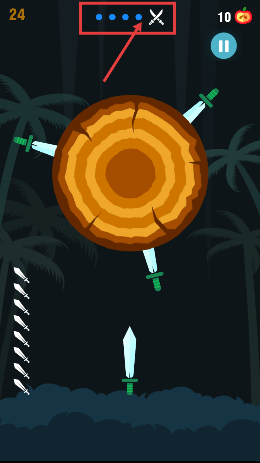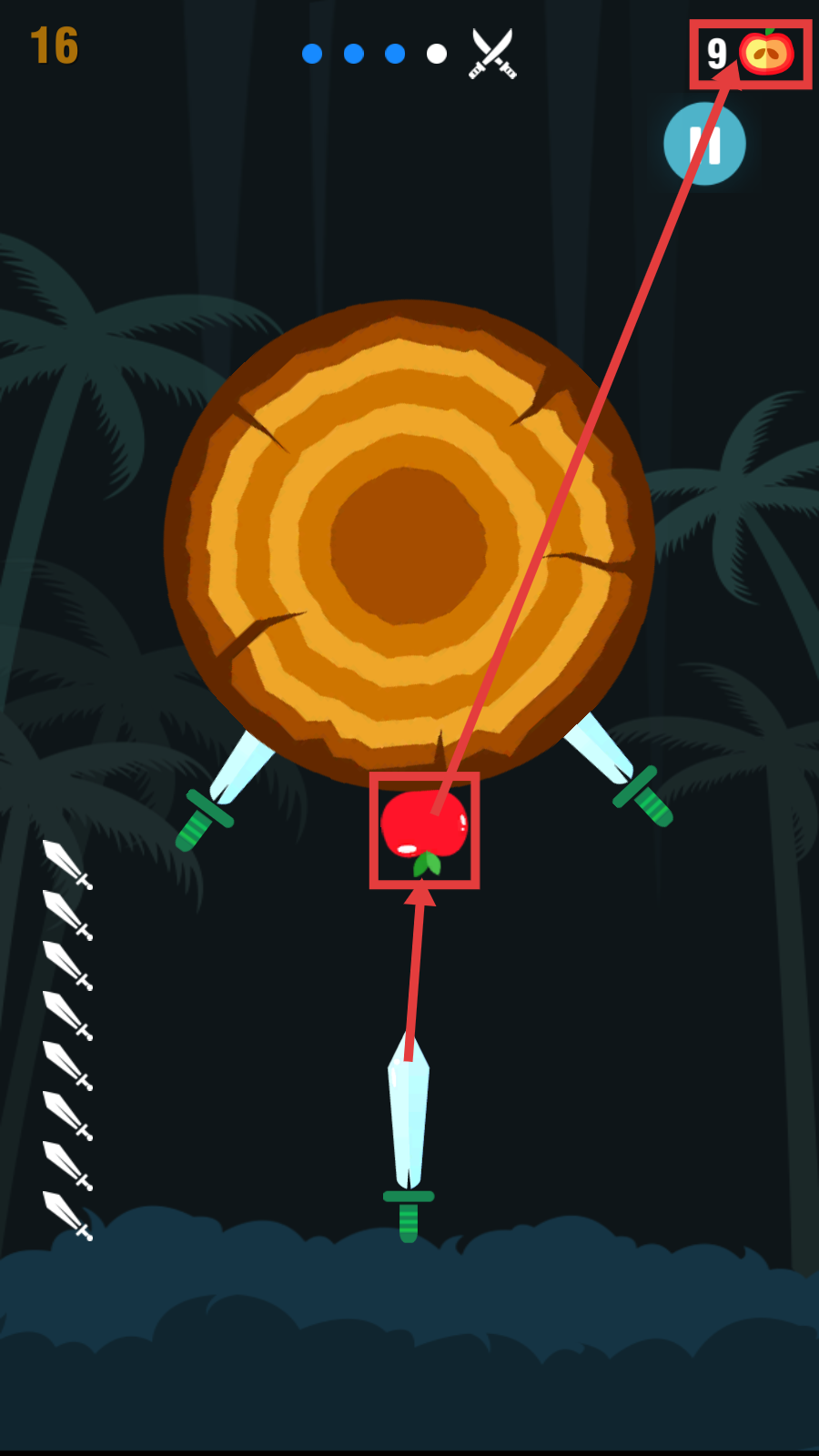 2、瞄准木盘上的【苹果】投掷刀具,收集苹果,提升右上角苹果数量,推进游戏进度。