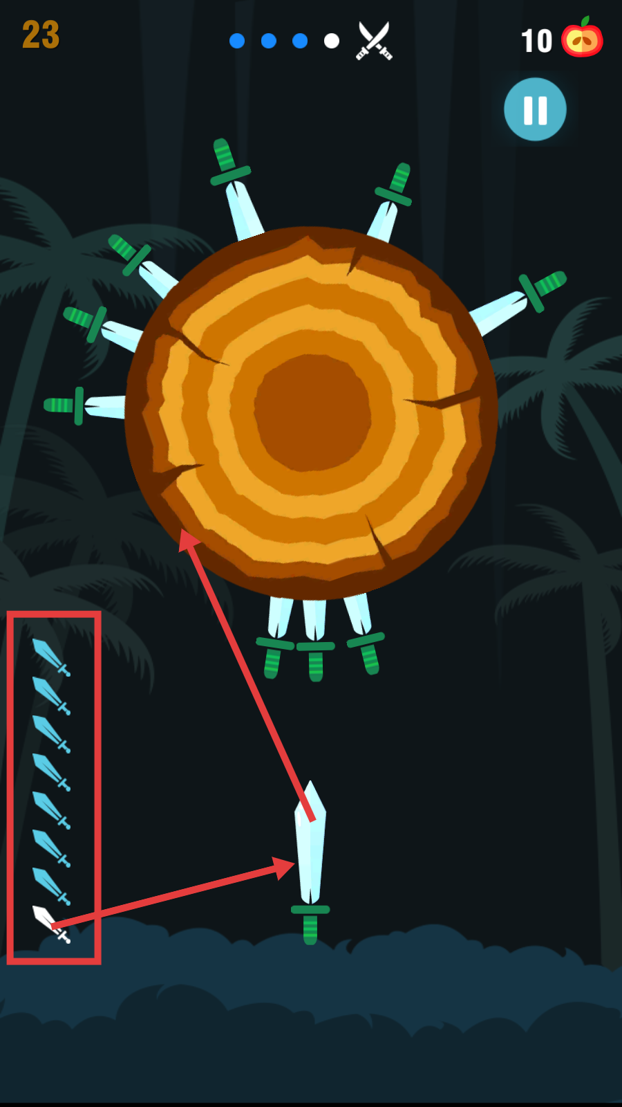 3、留意左侧刀具类型,选择合适的刀具投掷到木盘的空白区域,避免与已有刀具碰撞。