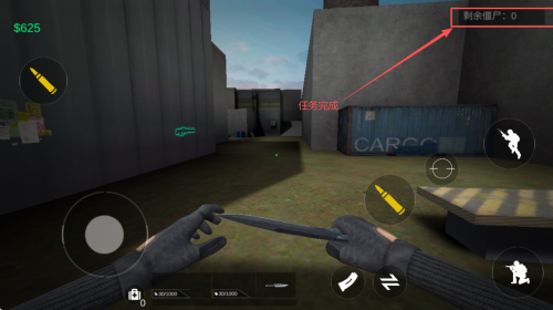 4、如何完成任务:继续击杀所有出现的僵尸,直到屏幕右上角显示“剩余僵尸:0”,此时表示你已经成功完成任务。