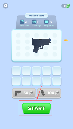 1、如何开始游戏:在主界面查看武器状态后,点击绿色的“START”按钮进入游戏。