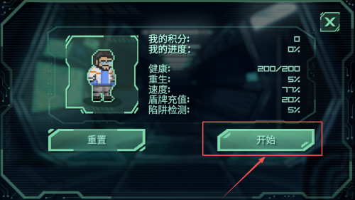3、如何查看角色状态:在角色状态界面,可以查看健康、重生、速度等属性,点击“开始”按钮开始游戏。