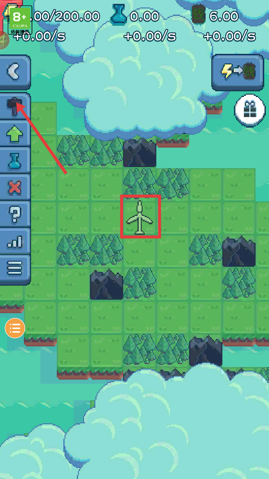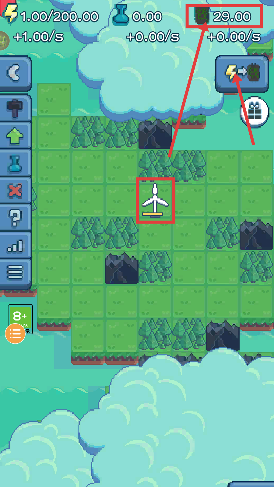 3、建造【风力发电机】后,关注资源变化,利用右上角按钮将电力转换为资源,积累发展资本。