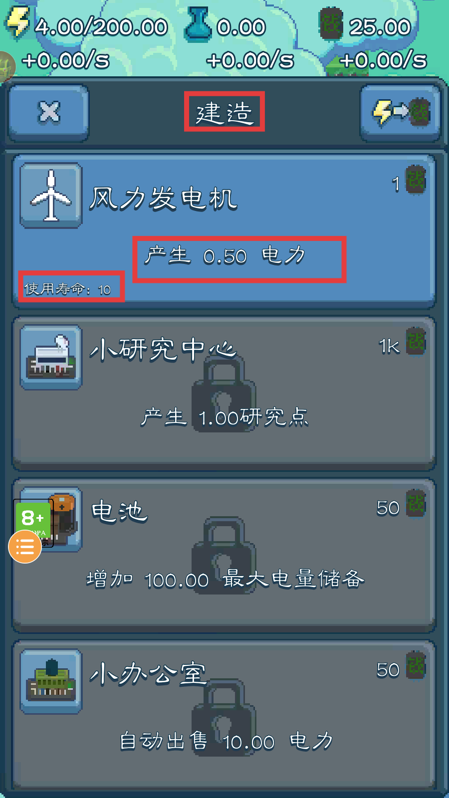 2、进入【建造】界面,优先选择【风力发电机】,其可产生【0.50电力】,使用寿命为10,为后续发展提供能源基础。