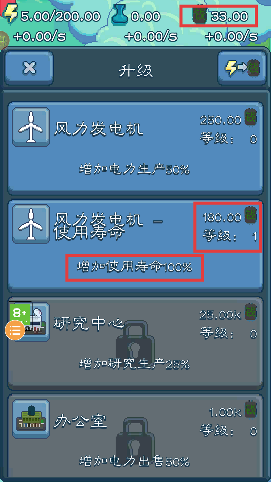 4、进入【升级】界面,消耗资源升级【风力发电机-使用寿命】,使其使用寿命增加100%,提升设施持续运营能力。