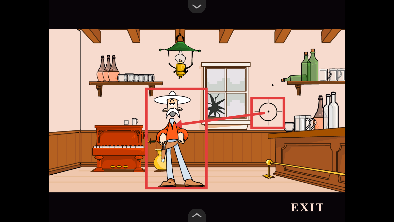 2、在酒吧场景中,瞄准牛仔周围的目标射击,利用点击操作精准命中,推进射击任务的进程。