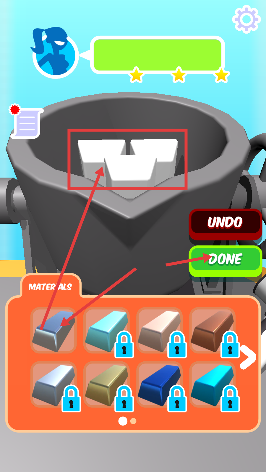 2、选择材料放入模具,确认后点击【DONE】,完成材料准备,为后续浇筑金属做准备,推进锻造进程。
