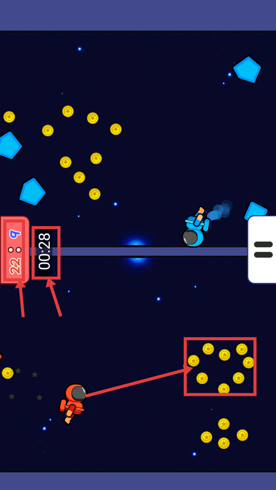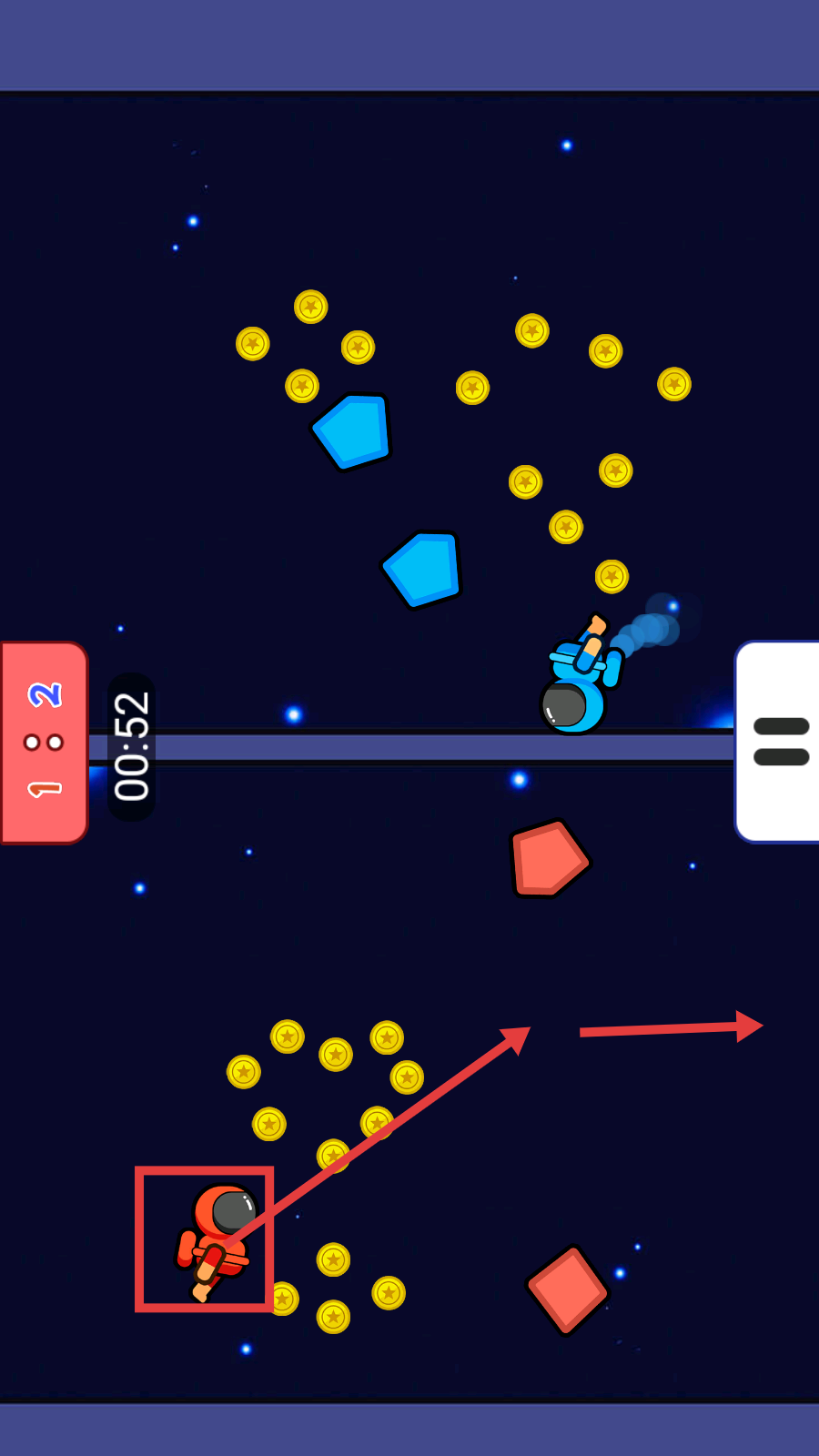 2、对战中操控红色宇航员,在太空赛道收集金币,躲避蓝色障碍与对手,推进对战进程,积累资源。