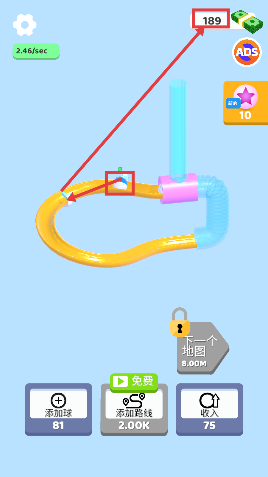 1、进入游戏后,观察小球在管道内的流动,初始积累资源(如189),熟悉资源产出机制,开启管道经营的第一步。