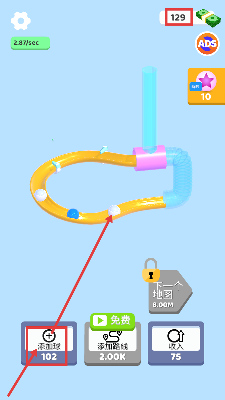2、点击【添加球】按钮,增加管道内小球数量(如从81增至102),提升资源获取效率,加快资源积累速度。
