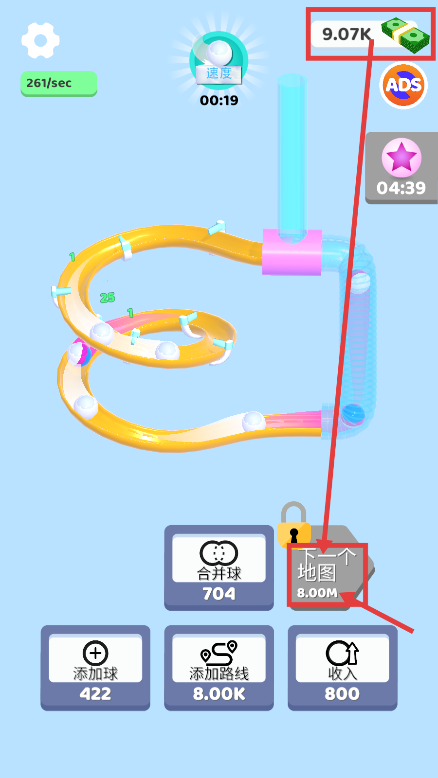 3、关注左上角速度(如从2.46/sec提升至8.61/sec),通过增加小球和优化管道,持续提升资源产出速度,让资源数(如199)快速增长。